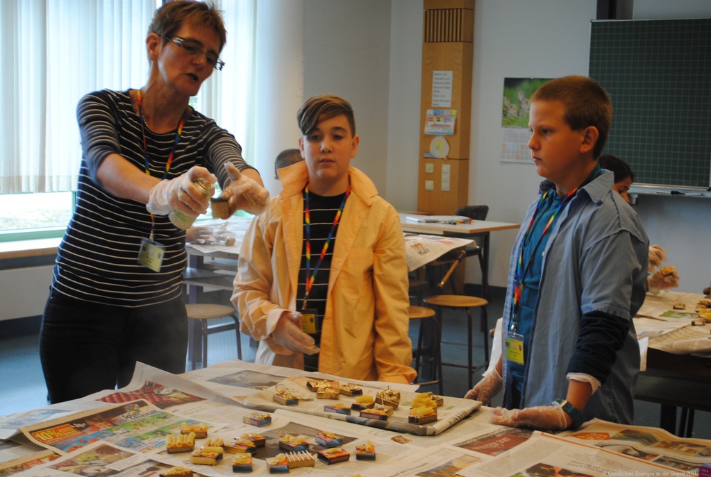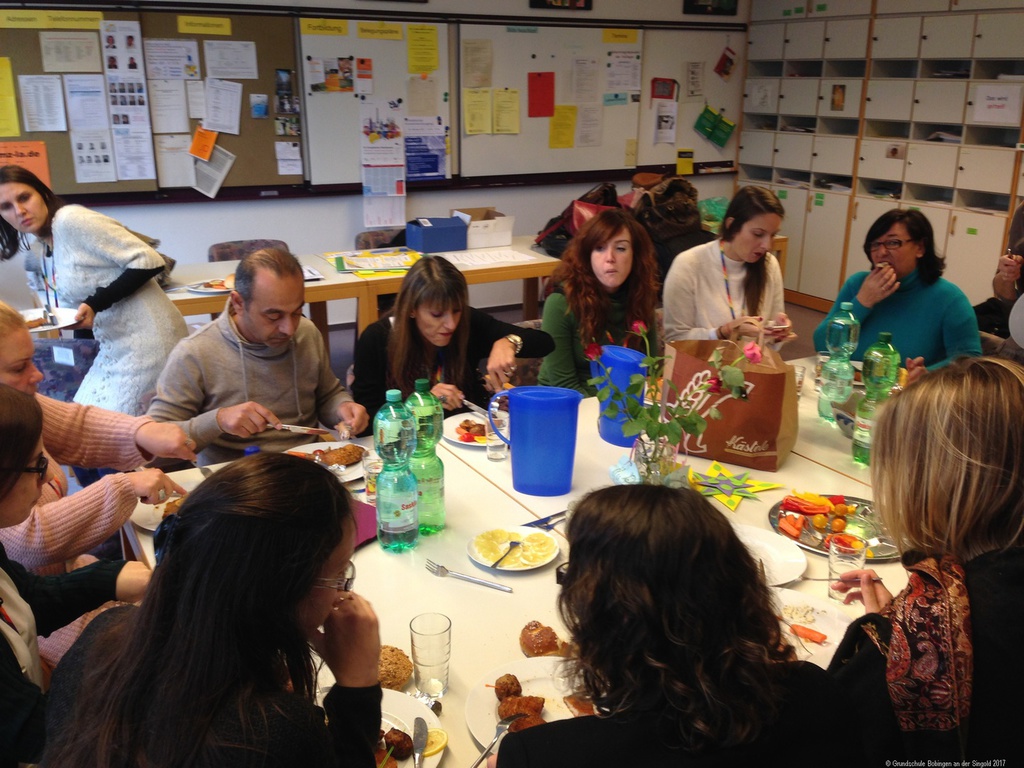 | Nach der Begrüßungsfeier stellen sich die Lehrer gegenseitig ihre Plakate und Ideen zum Projekt-Thema "Lernen des Lernens" vor. Die Kinder basteln während dessen für den Weihnachtsmarkt am Donnerstag ... Dann gibt es Mittagessen, einen kurzen Empfang im Rathaus und danach geht es mit dem Bus nach Augsburg zur Stadtführung. | After the welcoming ceremony, the teachers introduce each other their posters and ideas on the project topic "learning to learn", meanwhile the children are tinkering for the Christmas market on Thursday ... Then, after lunch and a short reception in the town hall, the bus leaves to Augsburg for a city tour. | |