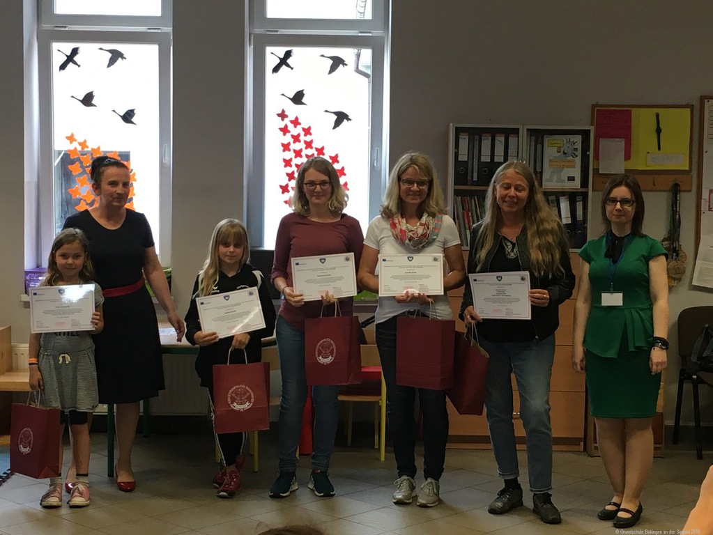After returning to school, the headmistress and Daria, the coordinator, greeted us very festively. Accompanied by great applause, each country team has now received the participation certificates. |