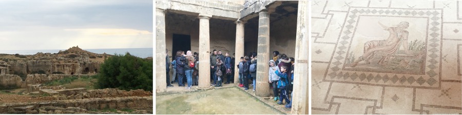 | Nach einer Mittagspause, die die Kinder in den Gastfamilien und die Lehrer im Hotel verbringen, holt uns der Bus nach Kato Pafos ab. Dies ist ein Stadtteil von Pafos, der direkt an der Küste liegt. Zunächst besuchen wir die Grabstätten der Könige Tombs of the Kings, ein Friedhof aus dem 4. Jahrhundert vor Christus. Verrückt, dass er diesen Namen trägt, obwohl dort niemals ein König begraben wurde! | After a lunch break with the children in the host families and the teachers in the hotel, the bus picks us up to Kato Pafos. This is a district of Pafos, which is located directly on the coast. First, we will visit the Tombs of the Kings, a cemetery from the 4th century BC. Crazy that he bears this name, although there was never a king buried there! | |