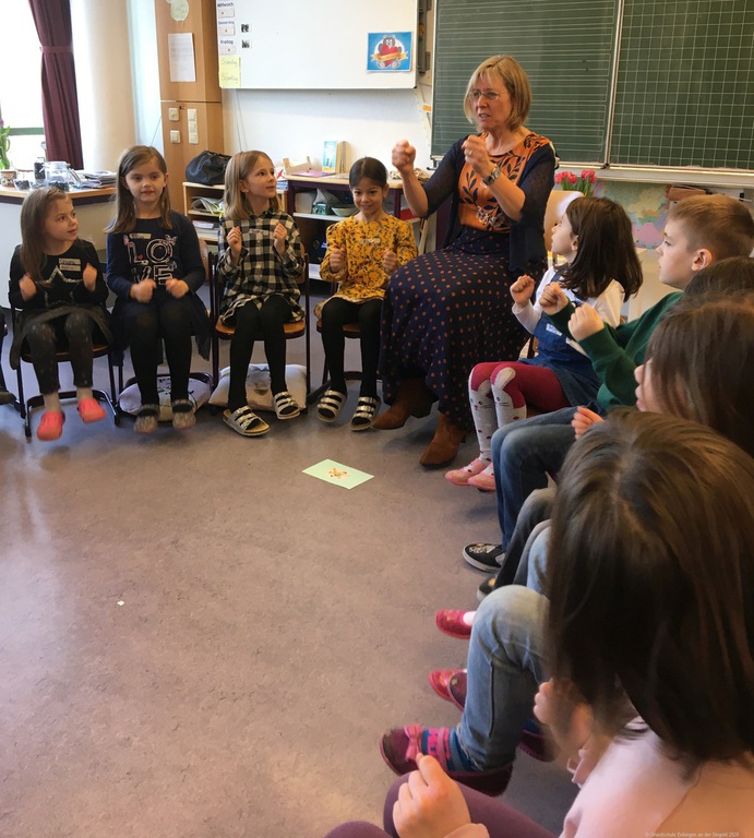 Kaum war sie da, begannen wir, sie mit englischen Fragen zu löchern: „What’s your name?“ „What’s your favourite colour?“, ... Frau Zitzelsberger (so hieß die Lady, stammt aber trotzdem aus England) lernte uns einen englischen Reim, an dem wir unsere Aussprache noch etwas trainieren konnten ...