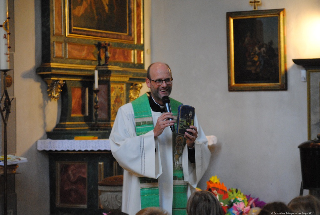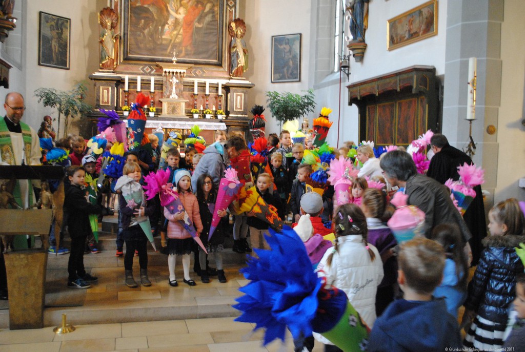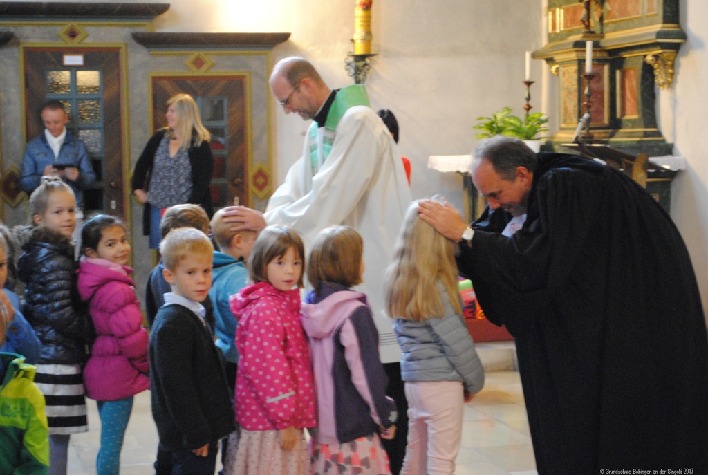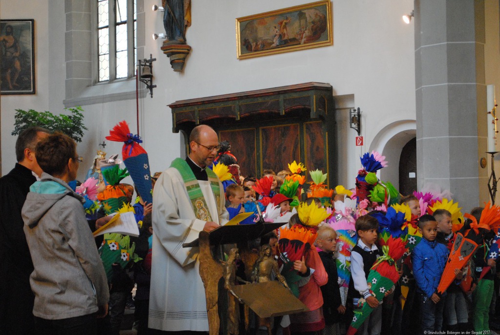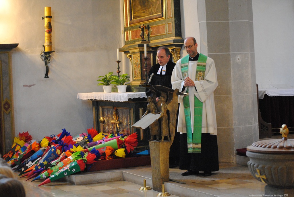 Mit einem ökumenischen Gottesdienst begann der erste Schultag für die Kinder der Laurentius- und Singoldschule: Mit ihren bunten Schultüten zogen sie in die mit Eltern und Verwandten voll besetzte Kirche ein. Pfarrer Lukas und Pfarrer Rauch führten die Kinder zum Altar, um sie und die ganze Kirche willkommen zu heißen. "Lasst die Kinder zu mir kommen" hieß dann auch das zentrale Thema der Feier: Die Kinder empfingen von den Geistlichen persönlich den Segen für einen guten Start in ihren neuen Lebensabschnitt.