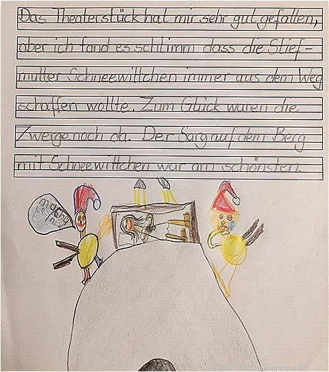 Wie jedes Jahr vor Weihnachten besuchten die ersten und zweiten Klassen eine Theateraufführung. Auch dieses Mal ging es wieder nach Diedorf ins Eukitea-Theater. Heuer stand Schneewittchen auf der Bühne.