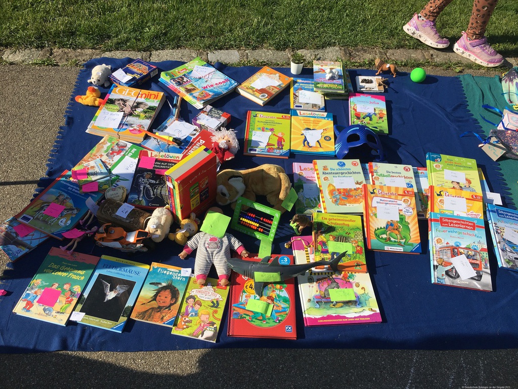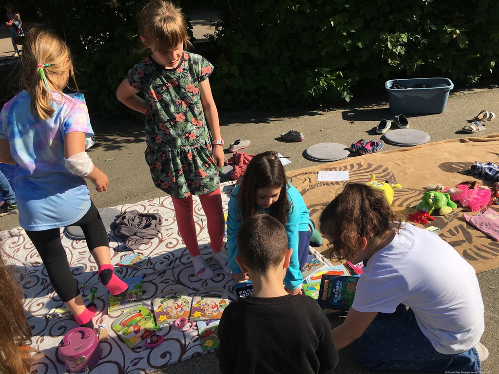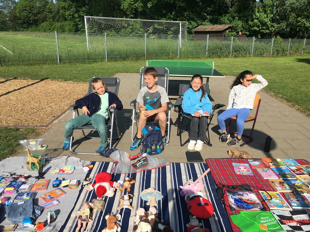 Bei bestem Wetter wurde gehandelt, gekauft und verkauft: Spielzeugautos, Brettspiele, Klamotten und auch die ein oder andere Ferienlektüre fanden so ein neues Zuhause. Die Freude war riesengroß, wenn sich ein lang gehegter Wunsch erfüllen ließ und so manches vor der Mülltonne bewahrt werden konnte.