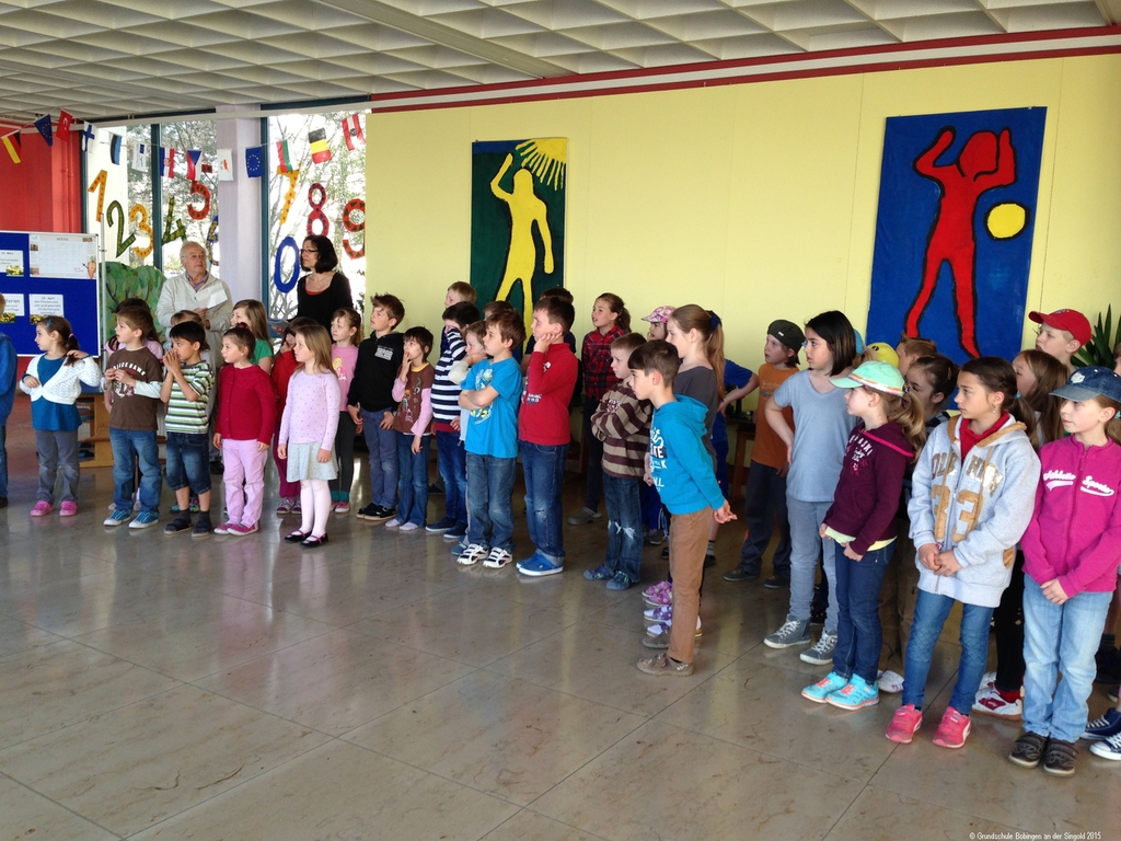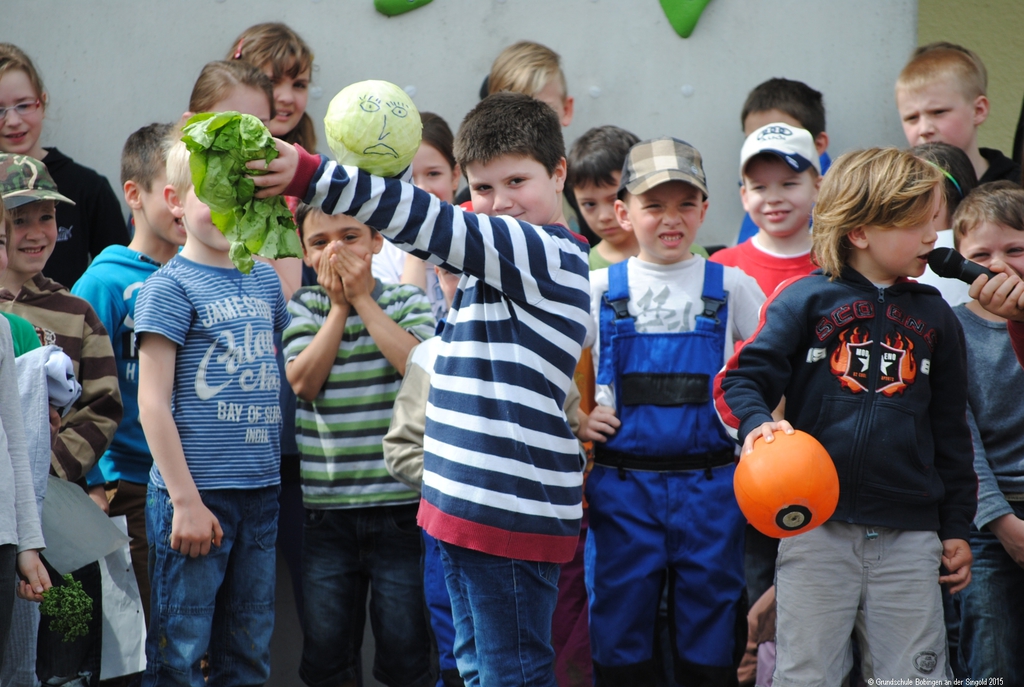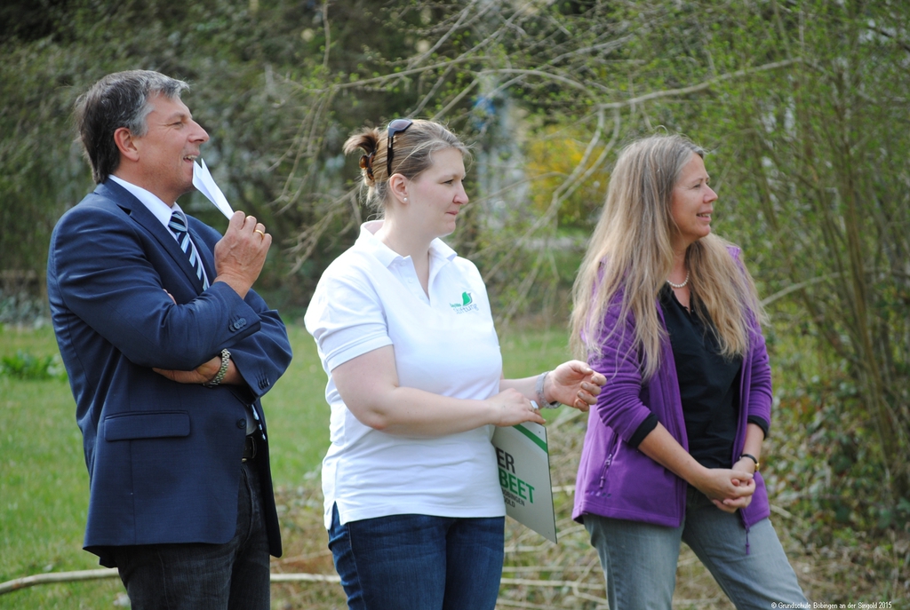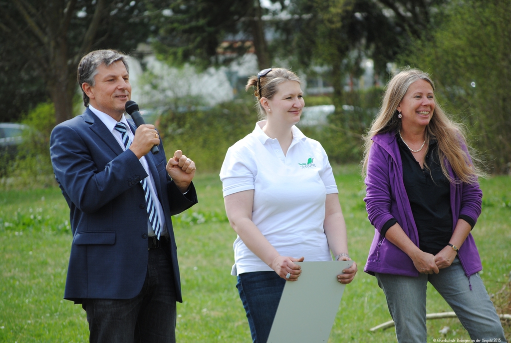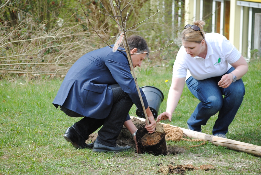 Herr Bürgermeister Müller, unsere Schulleiterin Frau Glockner und Frau Ast von der BayWa Stiftung pflanzten schließlich einen Apfelbaum im Schulgarten. Danach trugen einige Kinder der 2. Klasse lustige Verse vom „Gemüseball“ vor, und zum Abschluss des „offiziellen“ Teils sangen wir alle gemeinsam das selbst gedichtete „Gärtnerlied“.