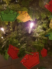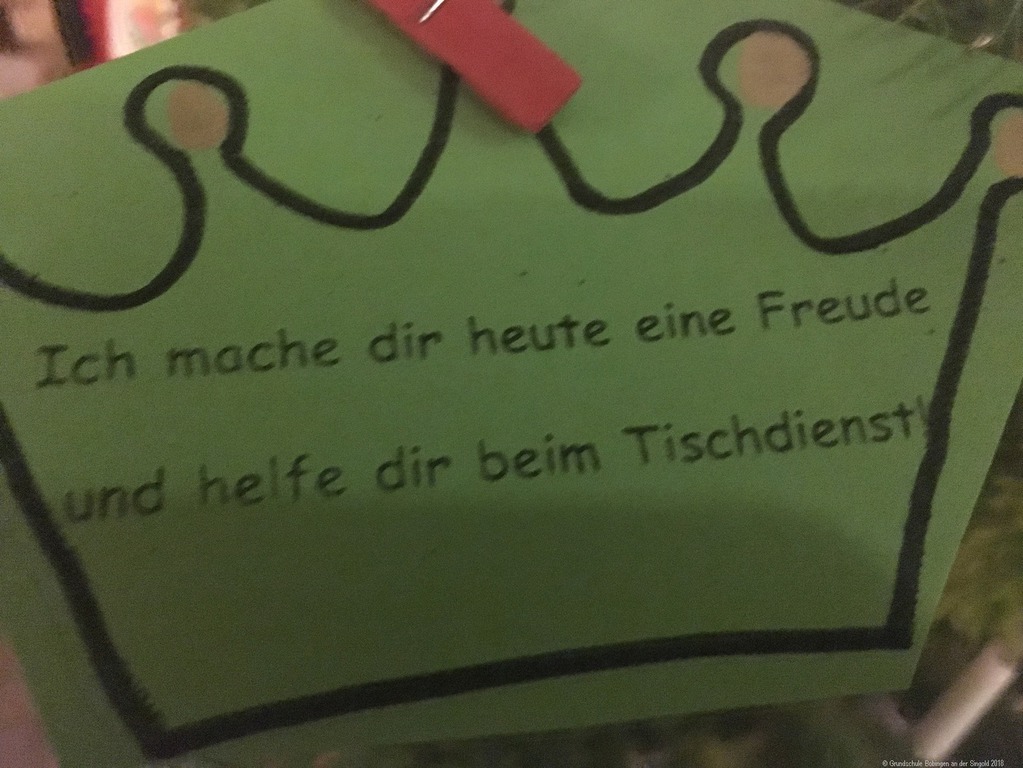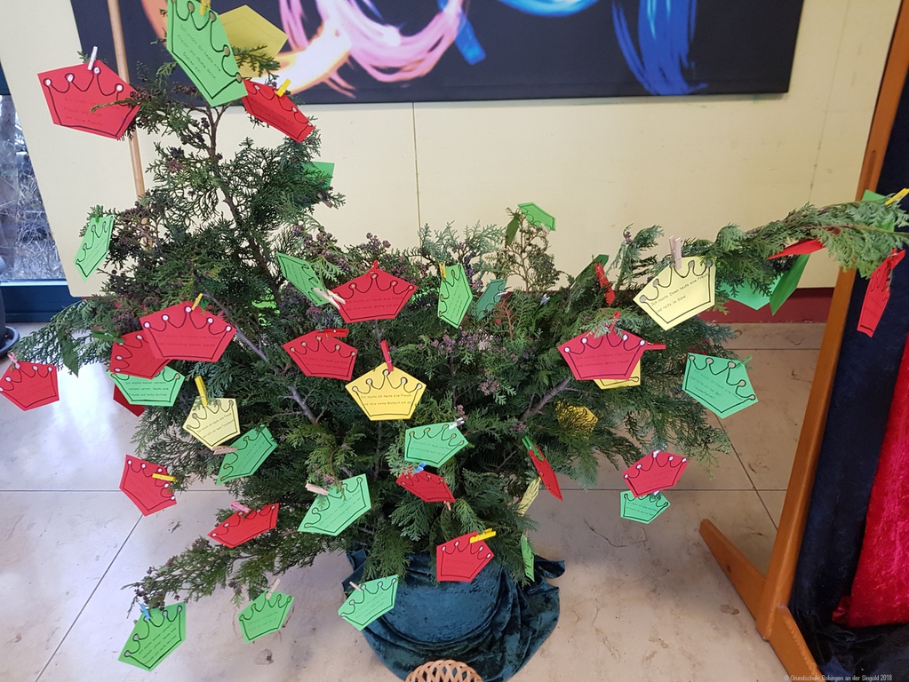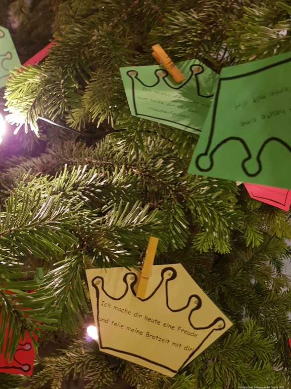 In der Aula haben wir einen Tannenbaum aufgestellt, viele bunte Kronen aus Pappe gebastelt und sie an die Zweige gehängt. Auf jeder Krone steht eine Freude, zum Beispiel: