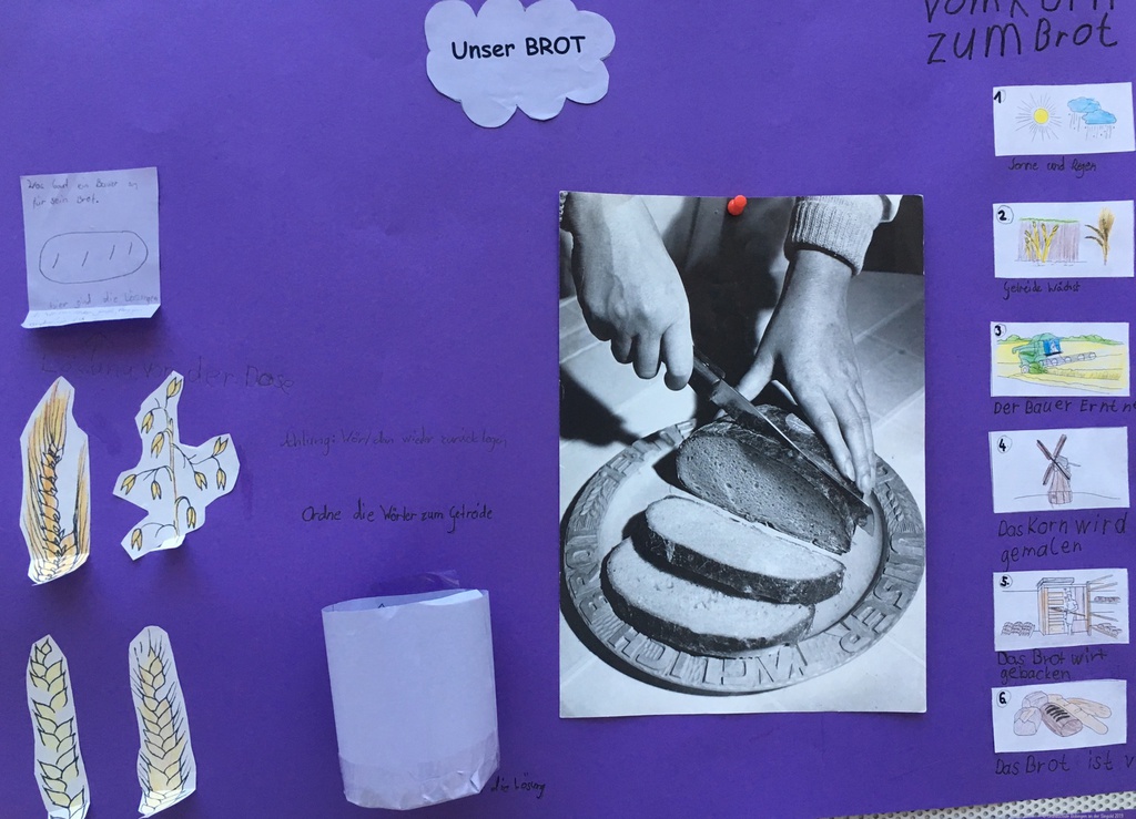 Dem täglichen Brot haben wir uns besonders gewidmet und uns mit seinem "Werden" auseinandergesetzt: Von den "himmlischen Zutaten" Sonne und Regen über das Wunder des Wachsens und Gedeihens bis hin zur menschlichen Hingabe bei Ernte und Herstellung.