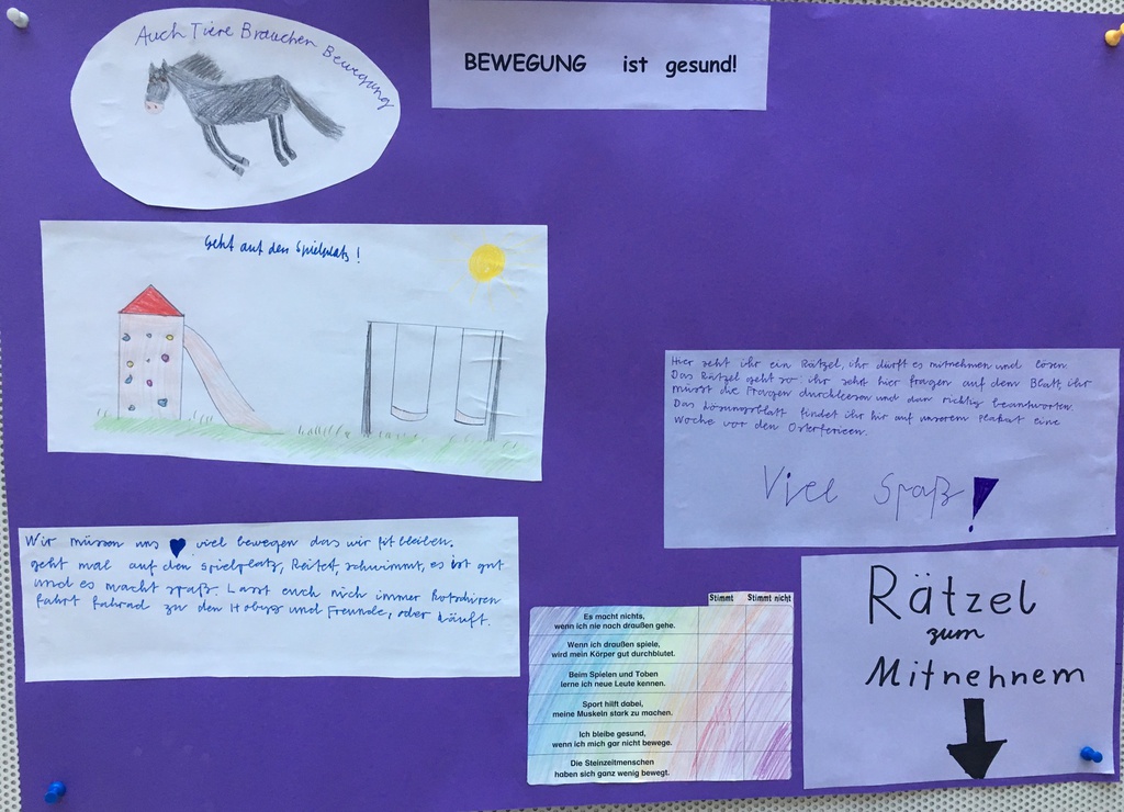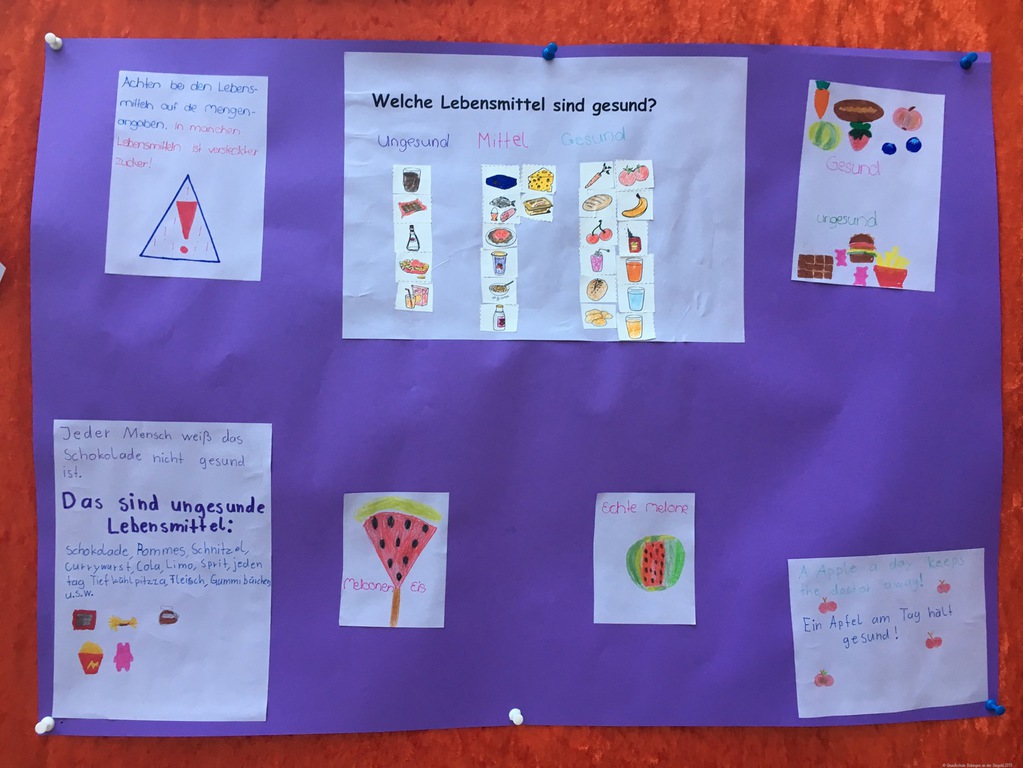 Wir haben uns in den Klassen damit befasst, was unserem Körper nützt bzw. schadet und welche Nahrungsmittel gesund sind. Dazu haben die Kinder Plakate gestaltet, die zum Mitmachen und Mitdenken einladen (Rätsel, lesen und sich die eigene Meinung bilden, Punkte setzen ...)