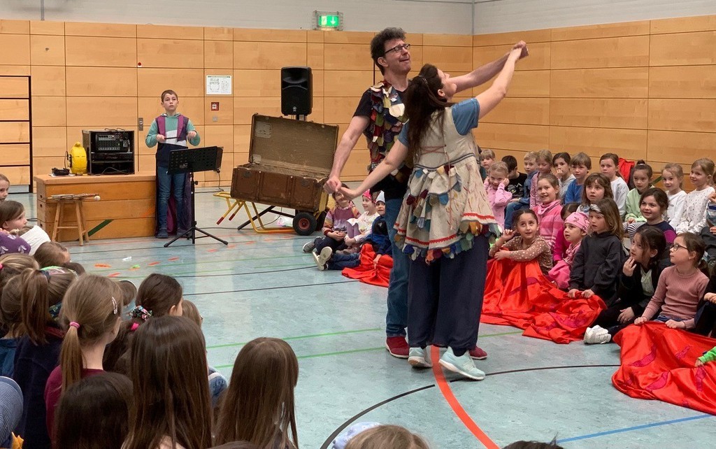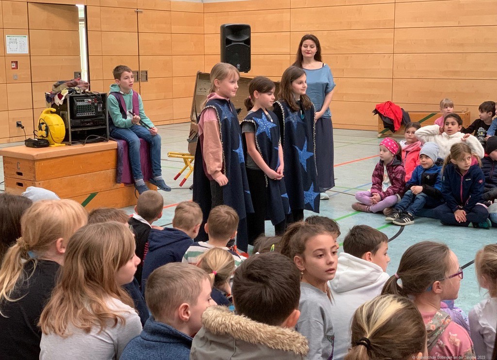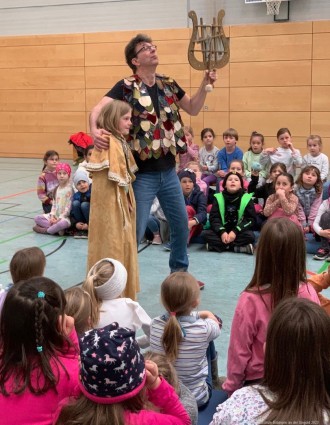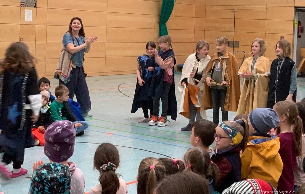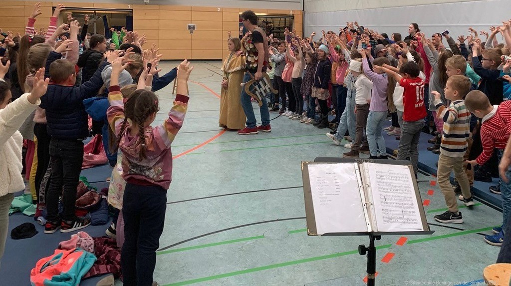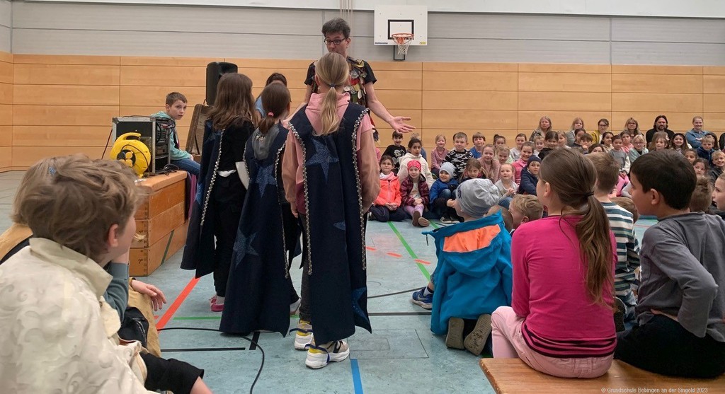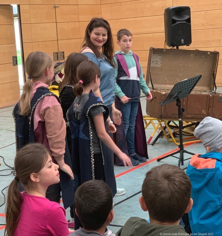 Obwohl – „besuchen“ trifft es nicht ganz: wir durften sogar mitmachen!! Eine Opernsängerin und ein Opernsänger hatten eine kindertaugliche Inszenierung der „Zauberflöte“ dabei und setzten einige Schüler als Maestro, als Tamino, als Pamina, als Königin der Nacht, als Dienerinnen für eben genannte Königin, als Sarastro und sogar als riesige Schlange, Wasser und Feuer ein.