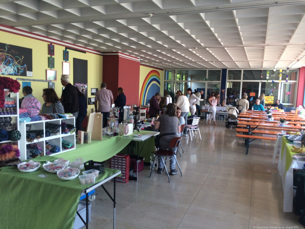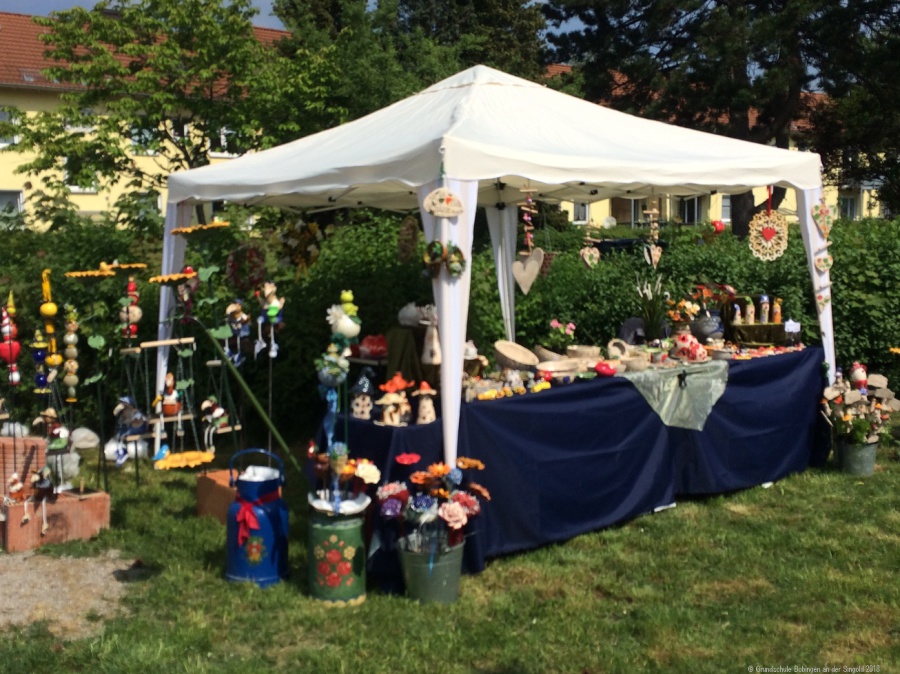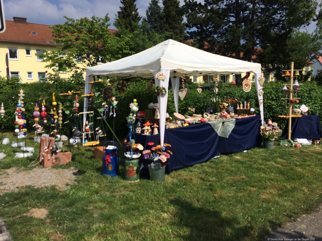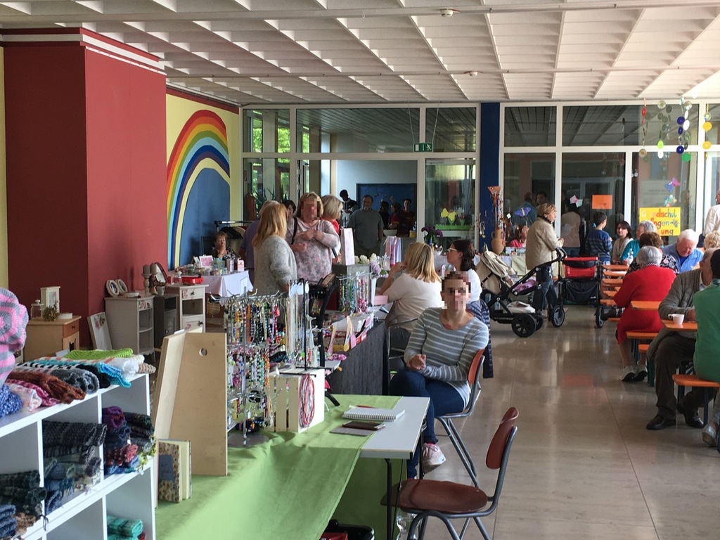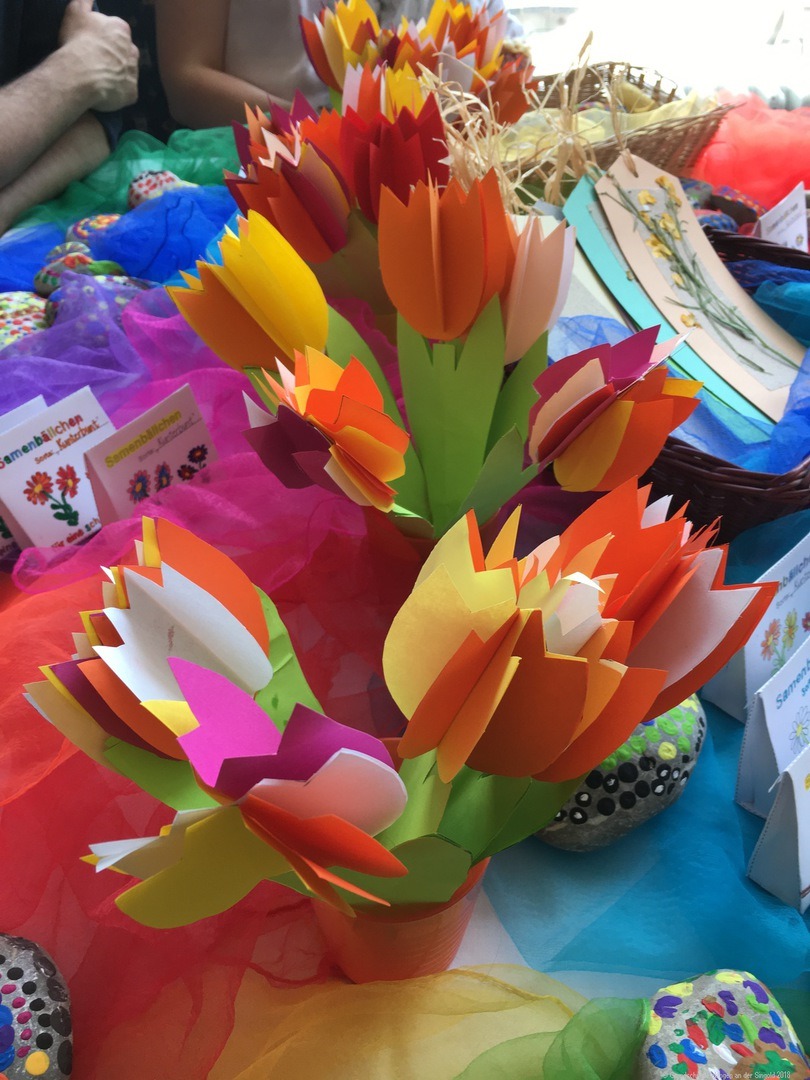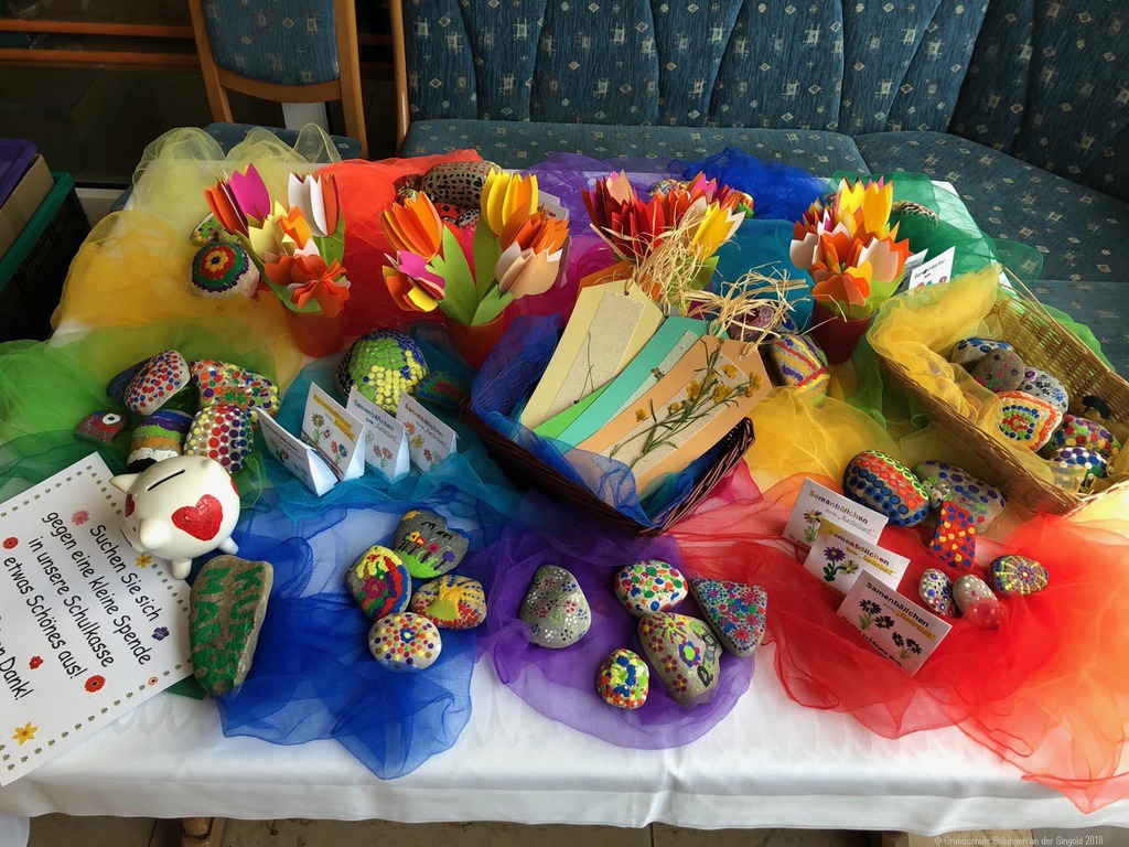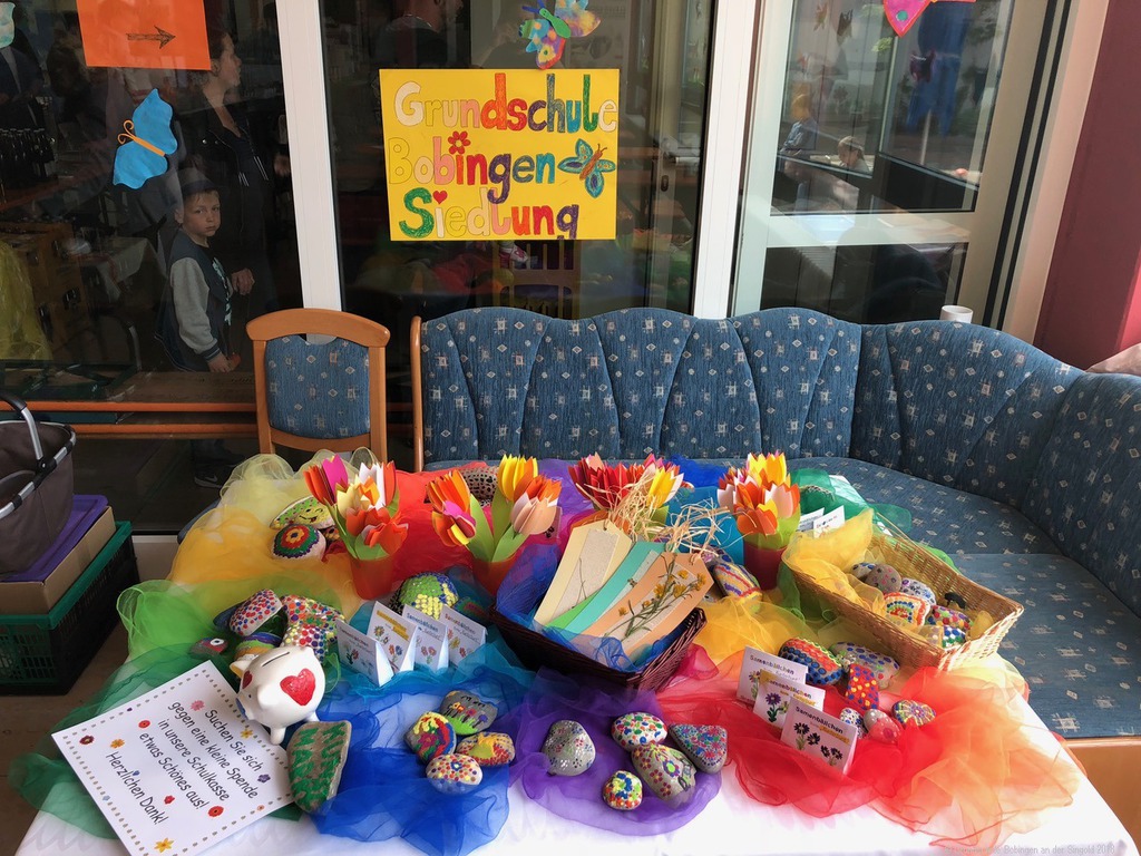 Mit einem bunten Tisch voller Kunst-Objekten aus dem Handarbeitsunterricht präsentierte sich unsere Siedlungs-Schule. Gegen eine kleine Spende konnten die Besucher frühlingshaft gebastelte Tonpapiertulpen, liebevoll bemalte kleine Tütchen mit Blumensamen, Lesezeichen mit gepressten Blumen oder auch aufwendig mit Dotpainting gestaltete Steine erwerben. Und am Ende des Tages war das Spenden-Sparschwein sogar ansehnlich gefüllt!