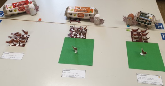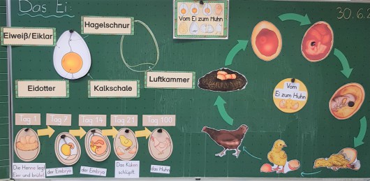 In der 1. Klasse gab es jede Menge Wissenswertes zu Henne und Ei zu entdecken. Dabei konnte man sich u.a über die Entwicklung eines Kükens oder über unterschiedliche Haltungsformen informieren.
