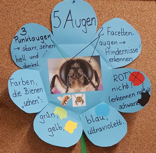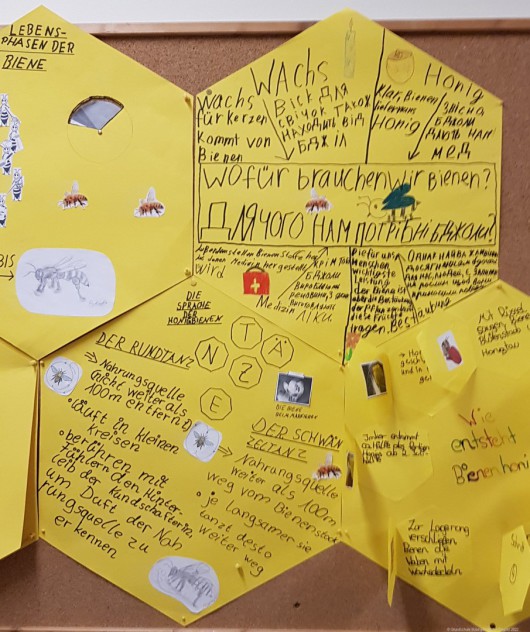 Nachdem die 4. Klasse im Herbst beim Bienenwettbewerb verschiedene Materialien gewonnen hatte, bot es sich an, in der Projektwoche das große Thema „Bienen“ zu bearbeiten. Wir befassten uns in kleinen Gruppen mit verschiedenen Aspekten zur Biene. Unsere Ergebnisse präsentierten wir - passend zum Thema - mit Plakaten in Waben- und Blütenform.