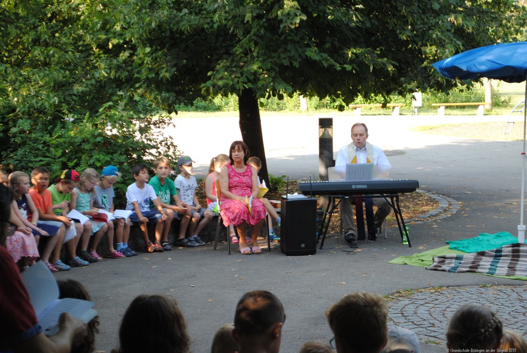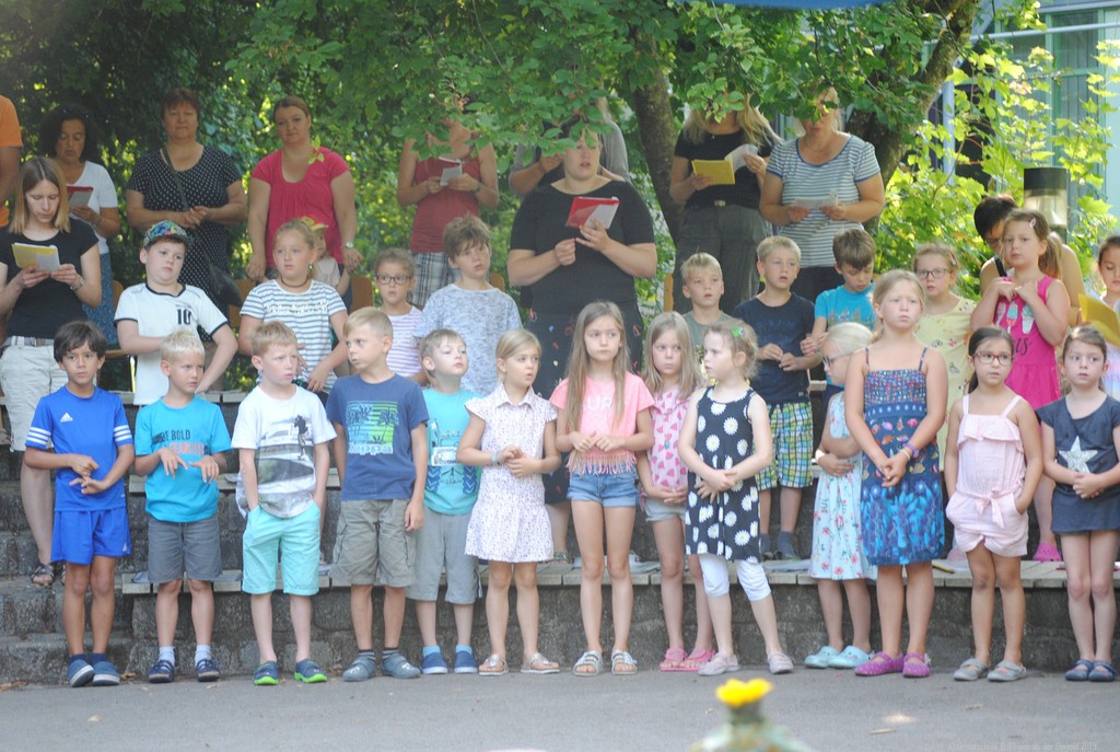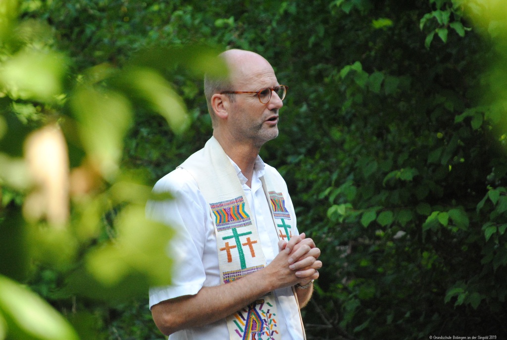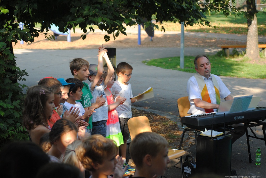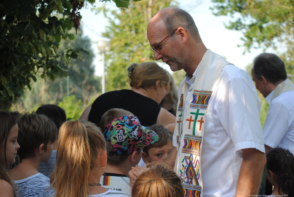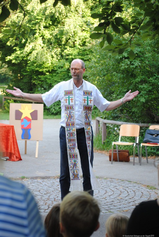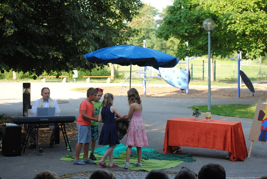 Langsam versammeln sich die Kinder im Rundtheater des Pausenhofs, 8 Uhr morgens, vorletzter Schultag, ökumenischer Abschlussgottesdienst für die ersten beiden Jahrgangsstufen (die anderen beiden kommen um 9 Uhr). Pfarrer Rauch und Pfarrer Lukas begrüßen die Klassen.
