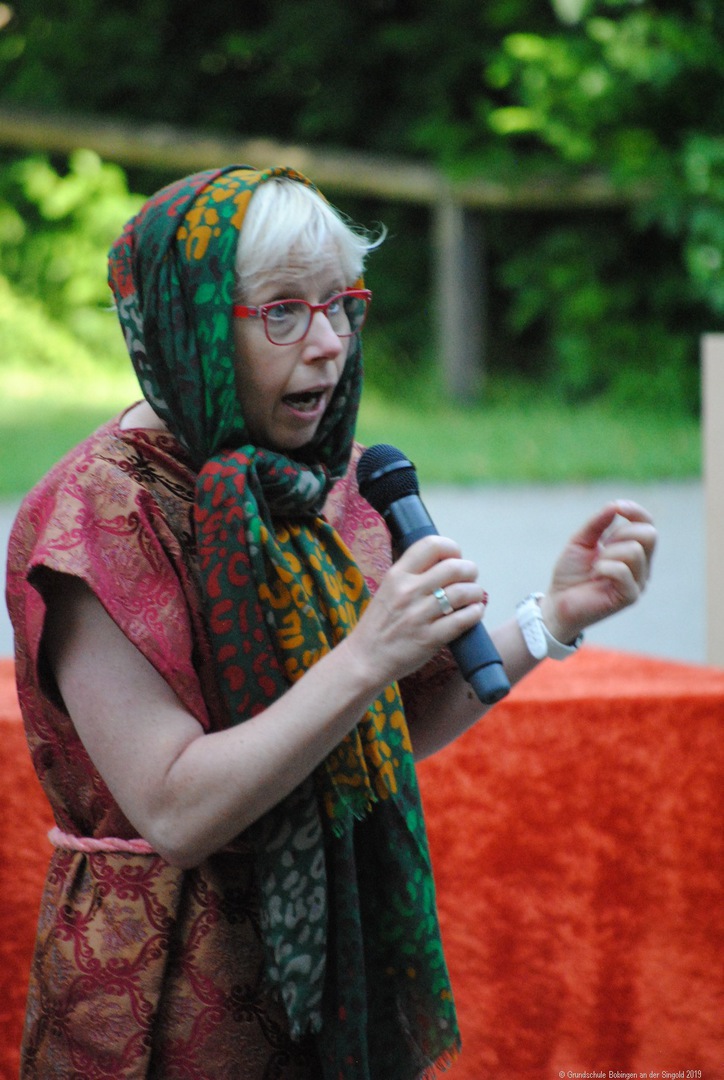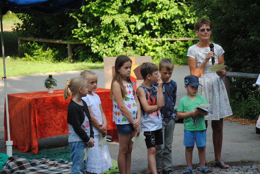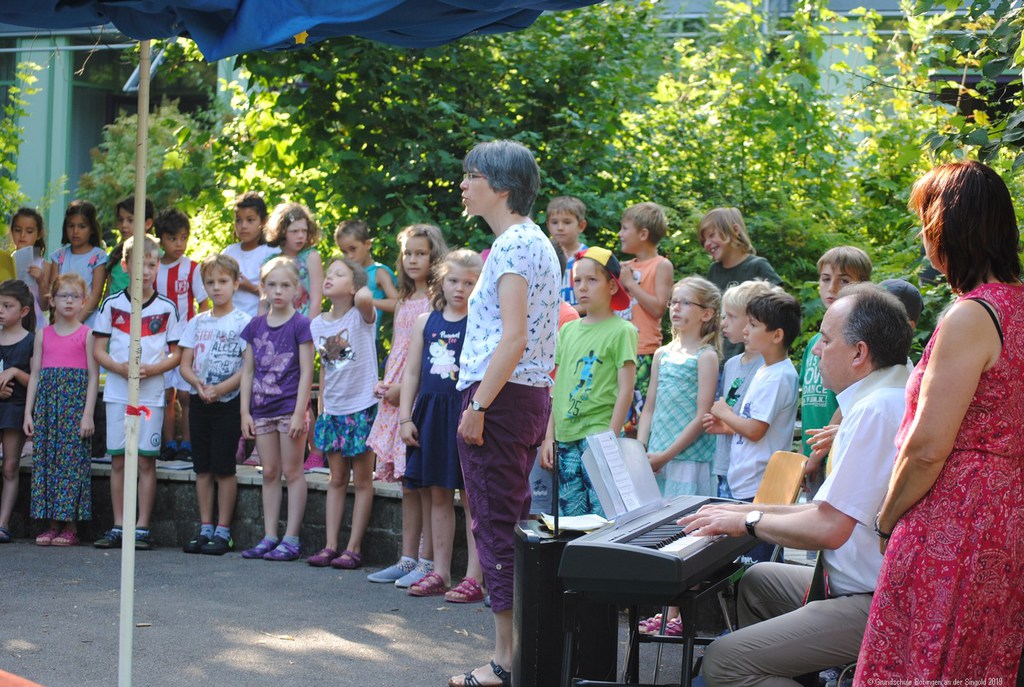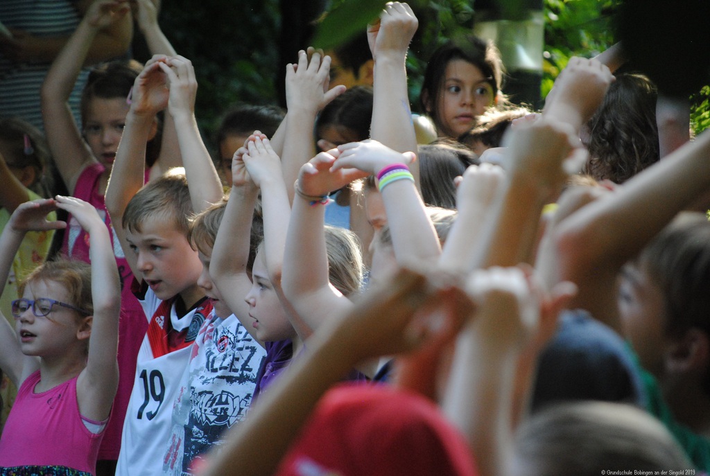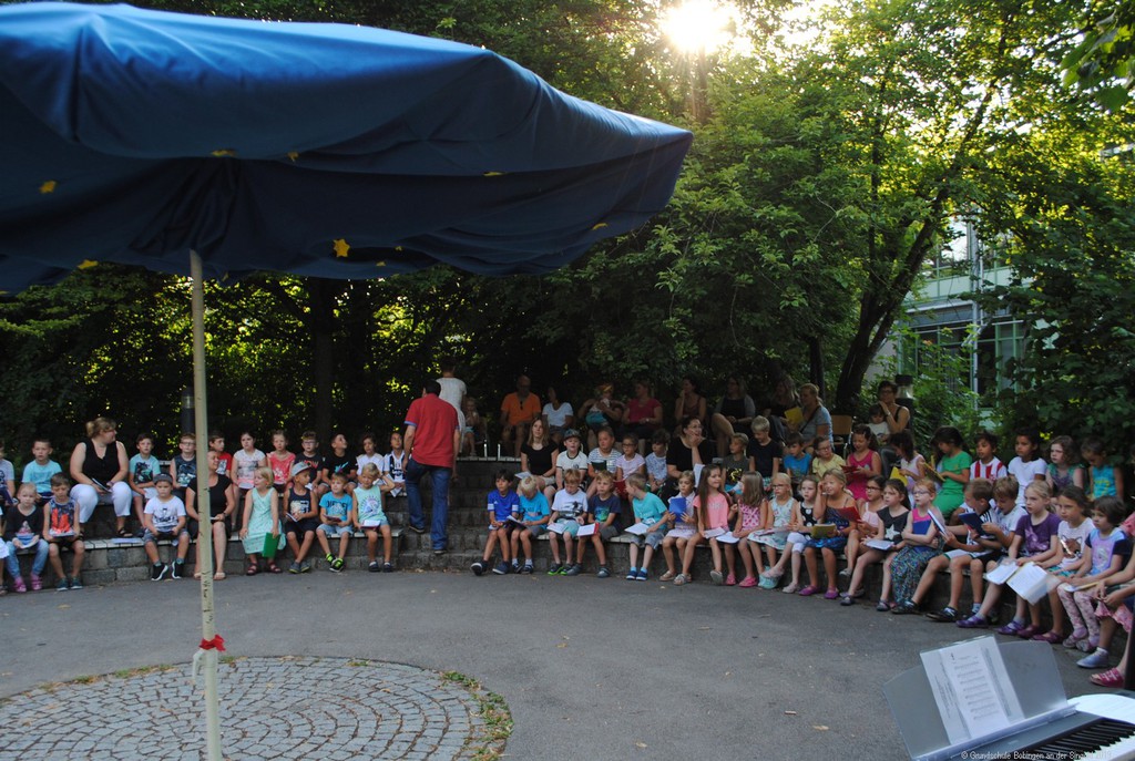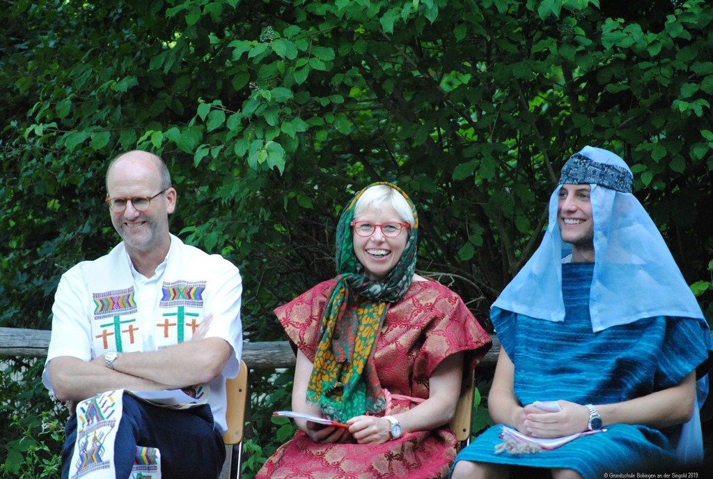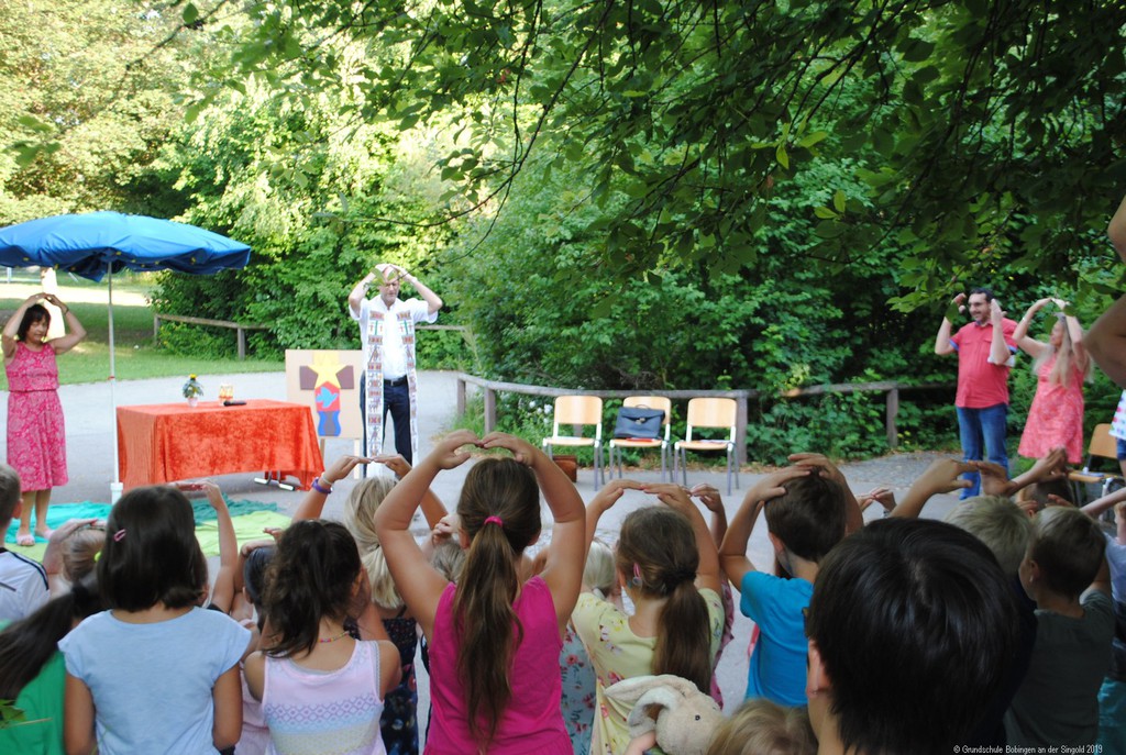 Langsam versammeln sich die Kinder im Rundtheater des Pausenhofs, 8 Uhr morgens, vorletzter Schultag, ökumenischer Abschlussgottesdienst für die ersten beiden Jahrgangsstufen (die anderen beiden kommen um 9 Uhr). Pfarrer Rauch und Pfarrer Lukas begrüßen die Klassen.