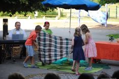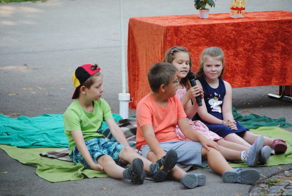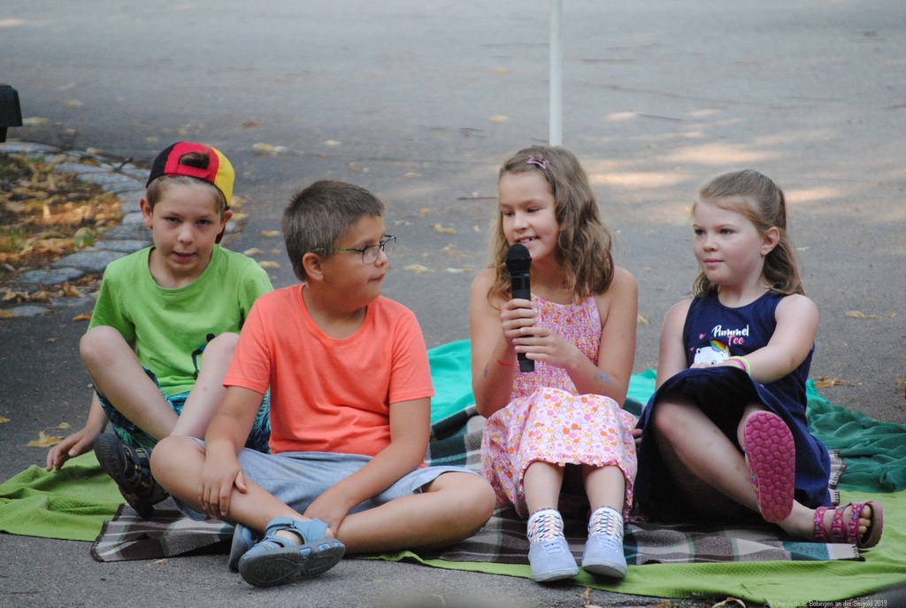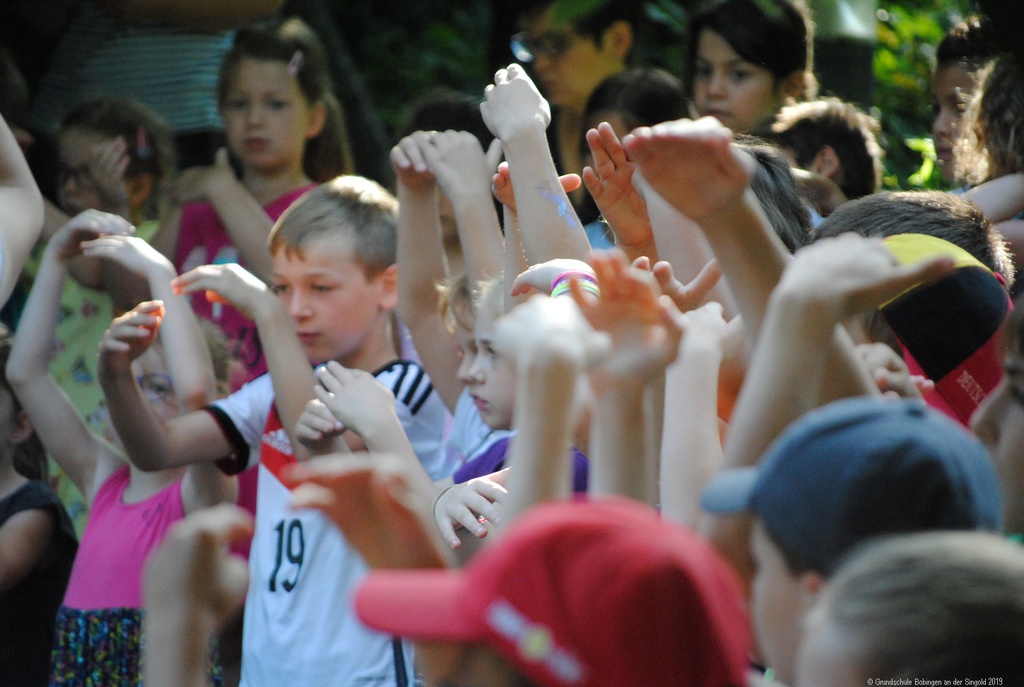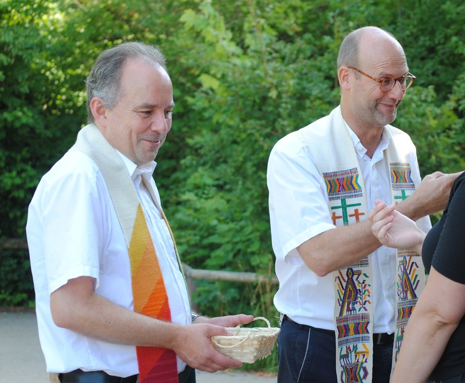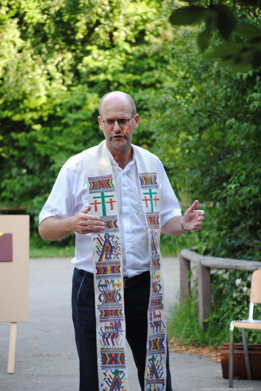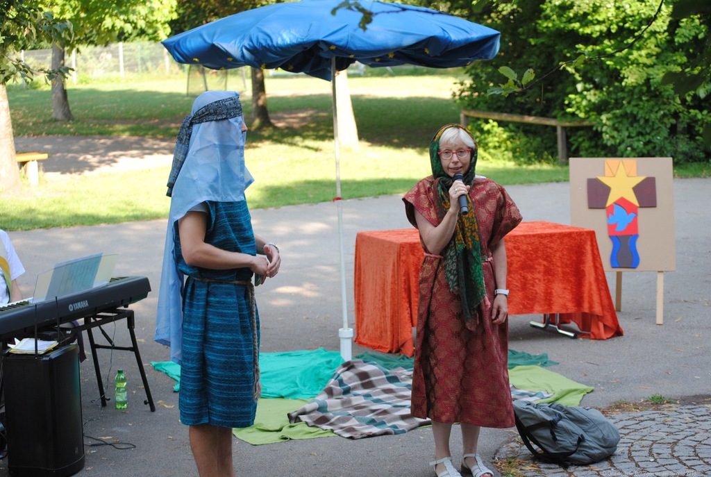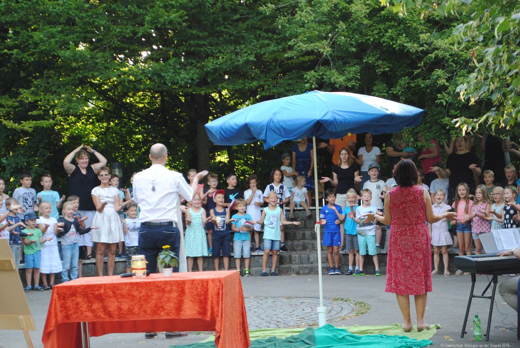 Langsam versammeln sich die Kinder im Rundtheater des Pausenhofs, 8 Uhr morgens, vorletzter Schultag, ökumenischer Abschlussgottesdienst für die ersten beiden Jahrgangsstufen (die anderen beiden kommen um 9 Uhr). Pfarrer Rauch und Pfarrer Lukas begrüßen die Klassen.