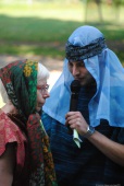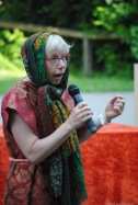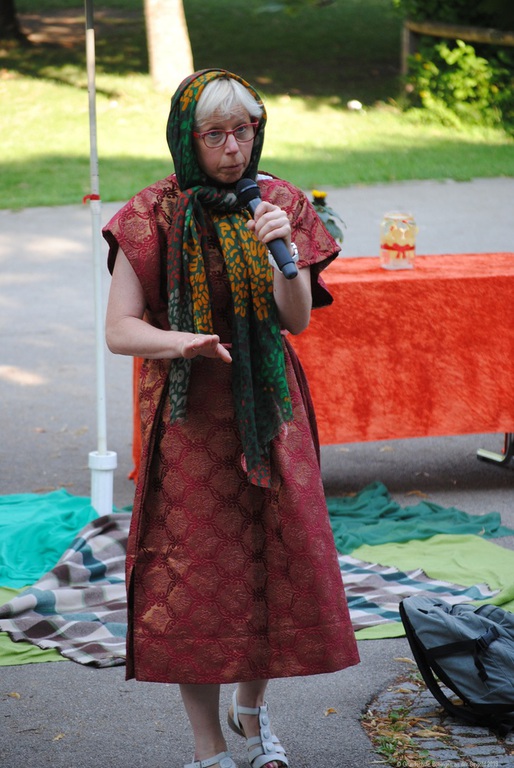 Eine Frau taucht auf, etwas orientalisch gekleidet. Sie schimpft und ist zornig! Auf ihre alten Tage soll sie noch mal weggehen von ihrem Zuhause, ihrer Heimat.