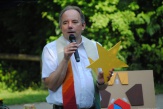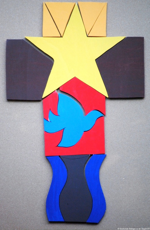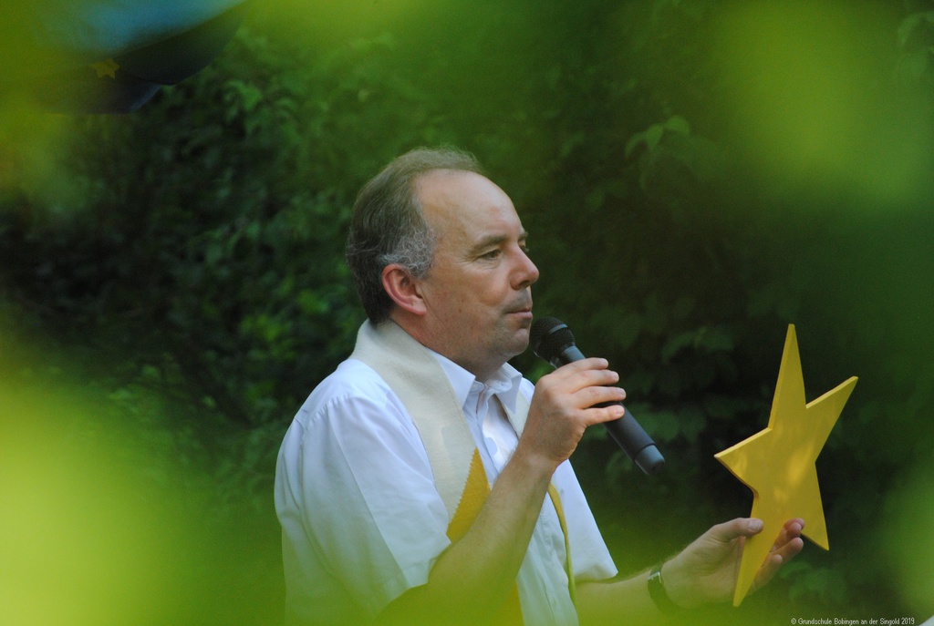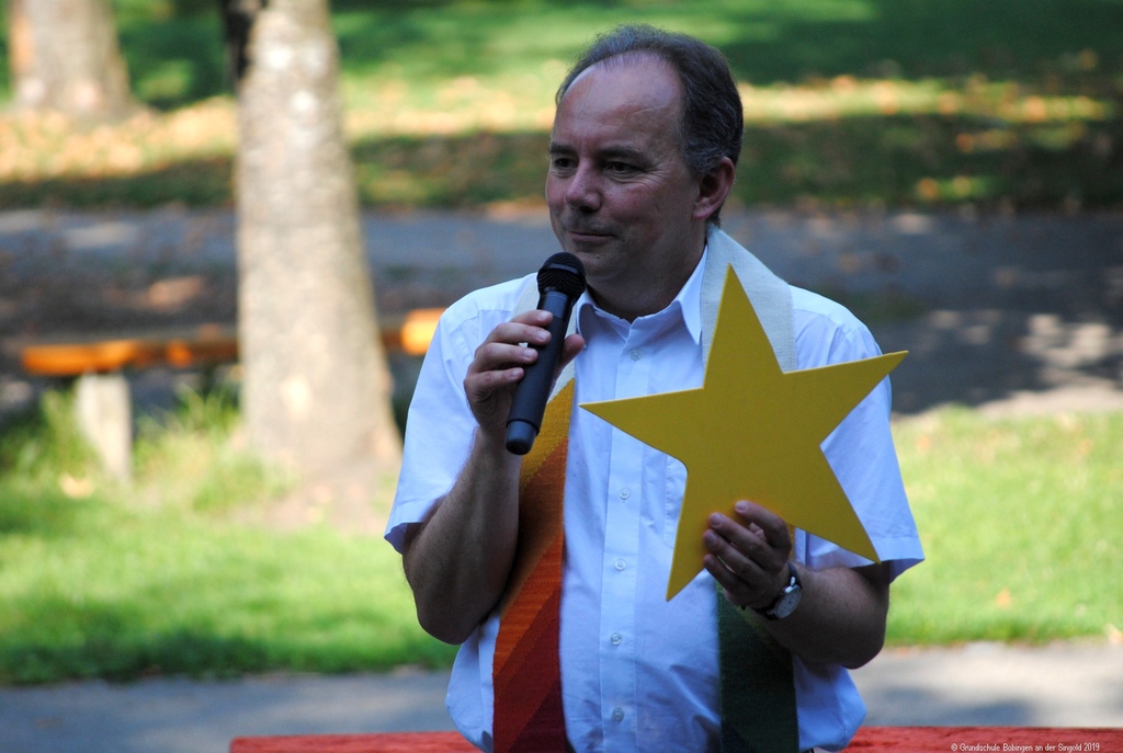 Pfarrer Lukas nimmt aus dem Friedenskreuz den großen Stern heraus und spricht davon, dass letztlich jeder Mensch und so auch jedes Kind hier im Pausenhof wie einer der unendlich vielen Sterne am Himmel ist. Jeder leuchtet für sich, jeder ist ein "Star".