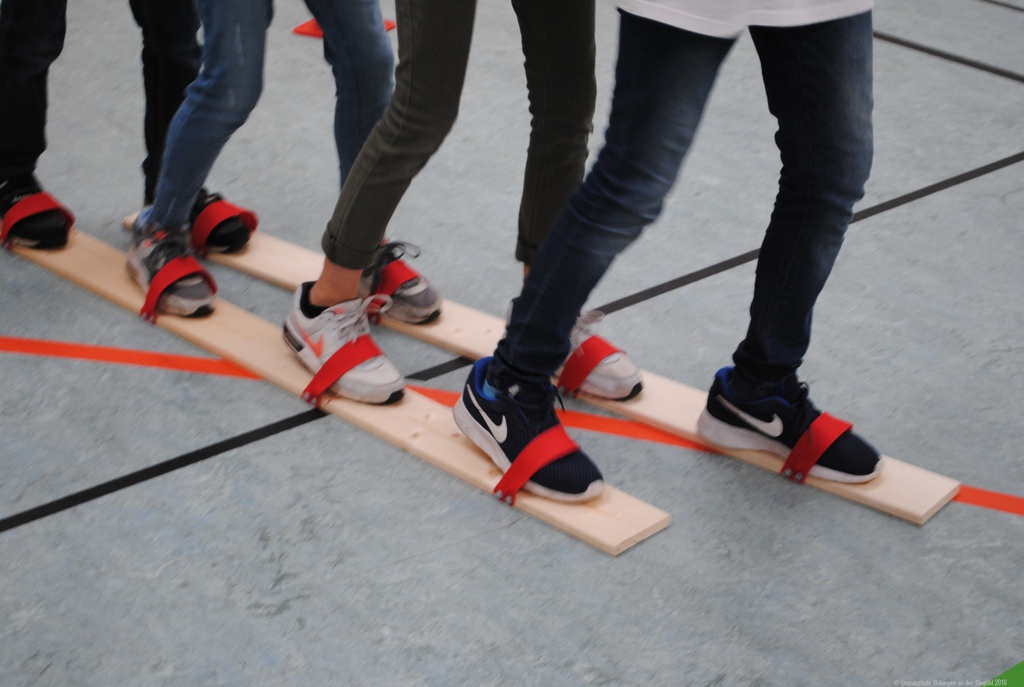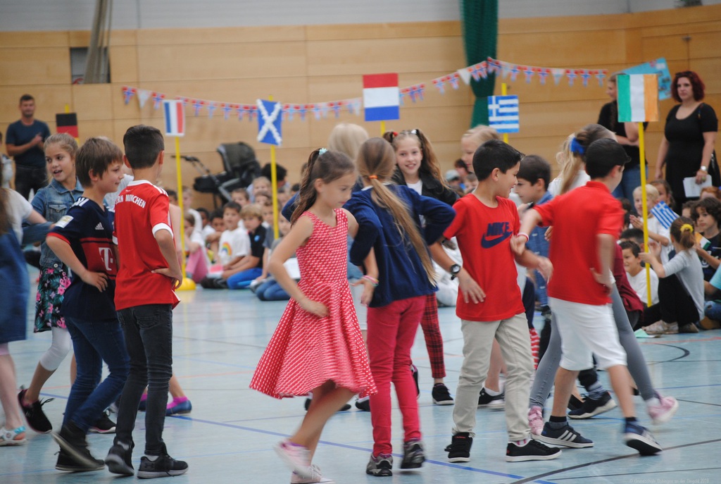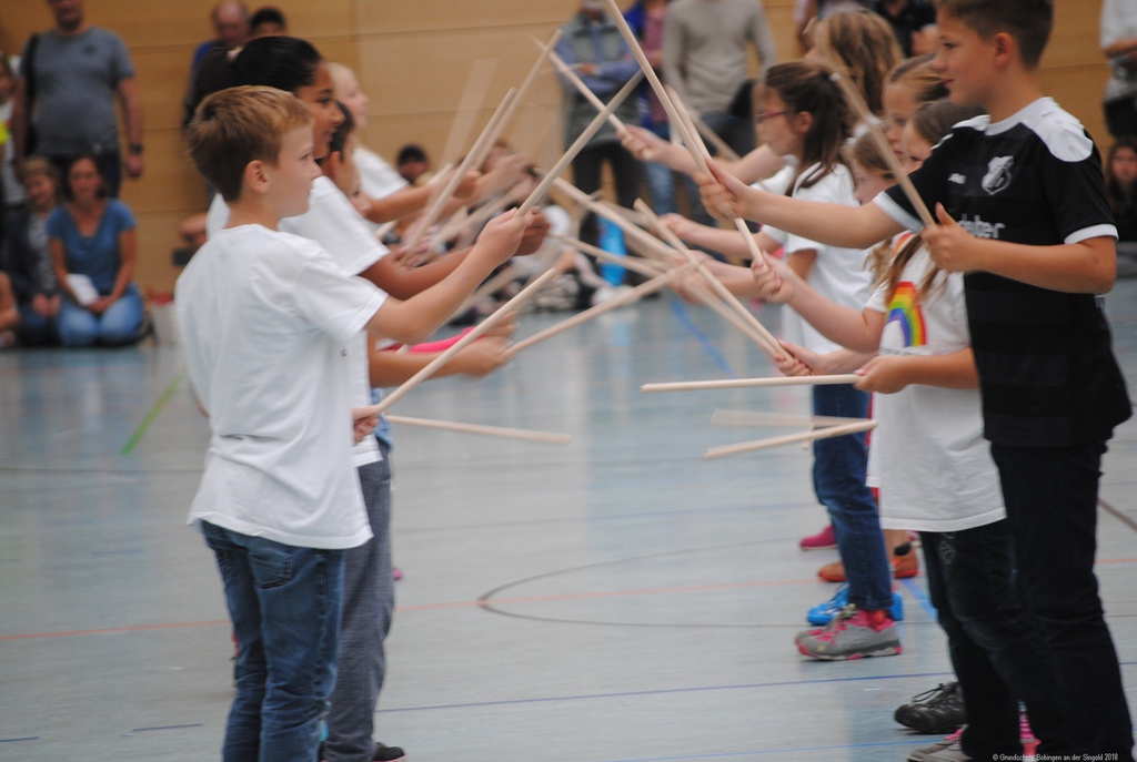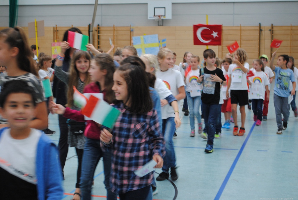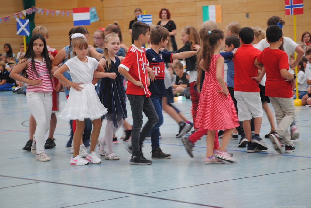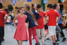 Nach einem fast olympischen Einzug in die Turnhalle (in der Eltern, Geschwister, Verwandte und Freunde gespannt warteten) erinnerten die bayerische Sternpolka und der valenzianische Stocktanz an die gemeinsamen Erlebnisse mit den Partnerschulen.