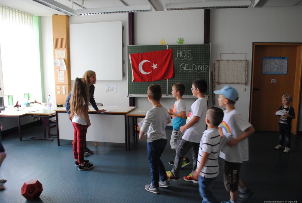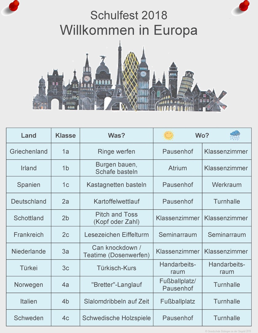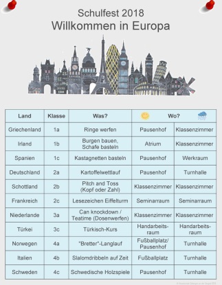Anlass genug, noch einmal über die Grenzen zu schauen: Lasst uns also eine Reise beginnnen, die uns durch Griechenland, Irland, Spanien, Deutschland, Schottland, Frankreich, die Niederlande, England, die Türkei, Norwegen, Italien und Schweden führen wird. Jede Klasse hatte zu einem dieser Länder etwas vorbereitet, und ihr habt nun die einmalige Gelegenheit, zu Fuß durch Europa zu wandern ...