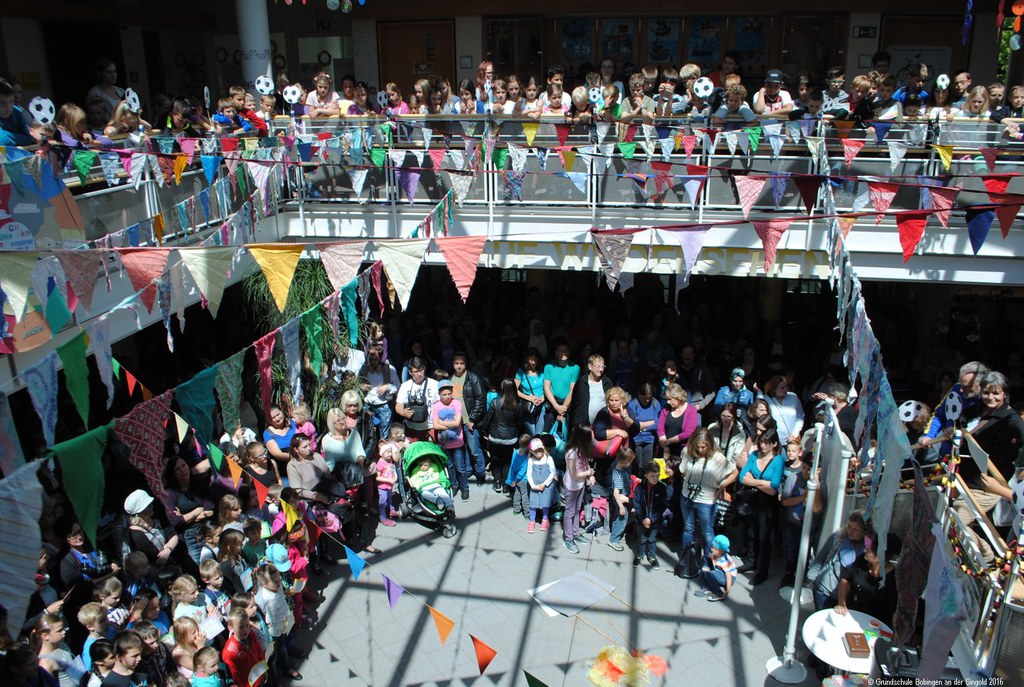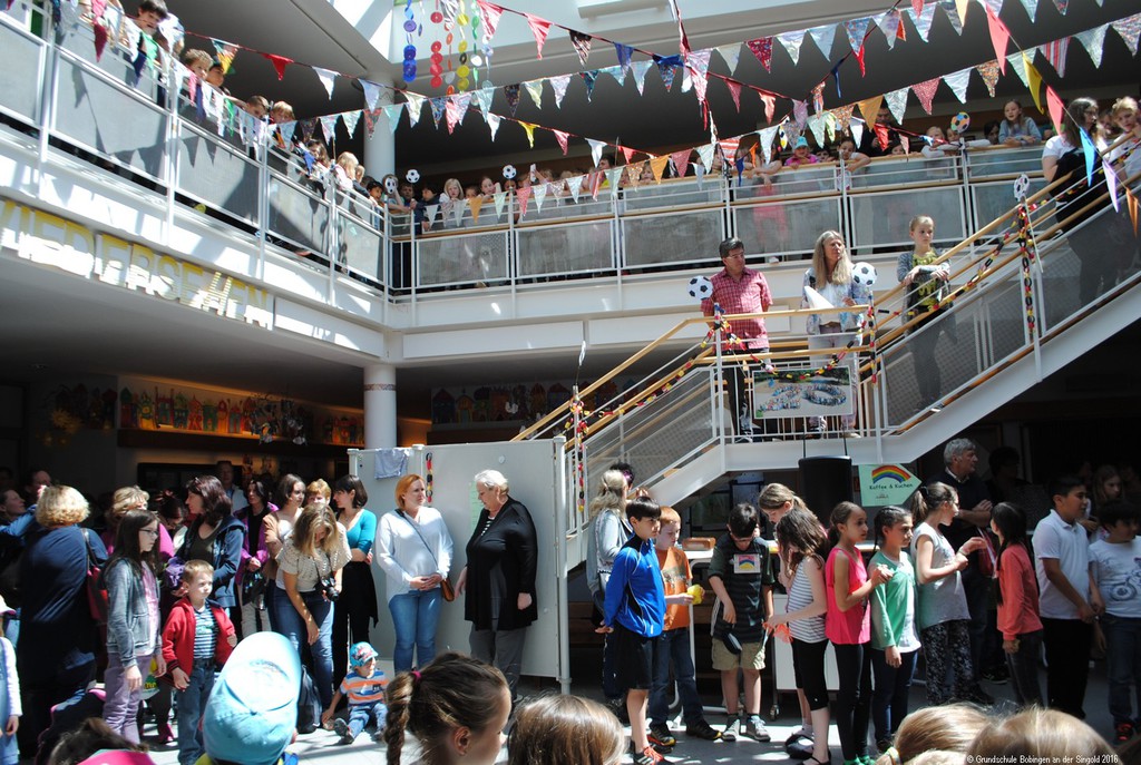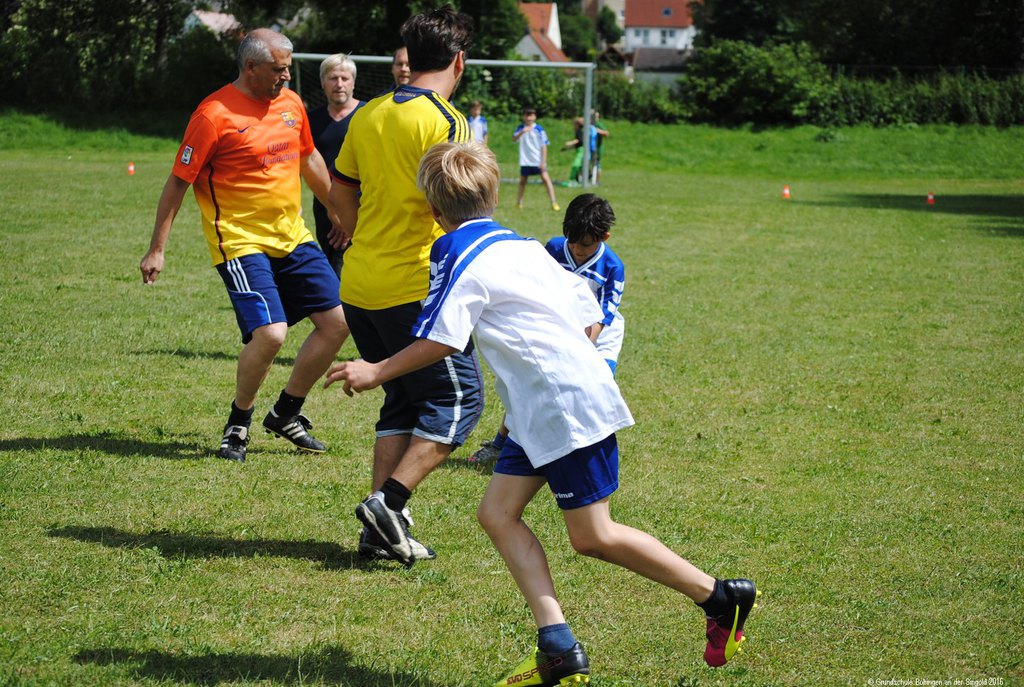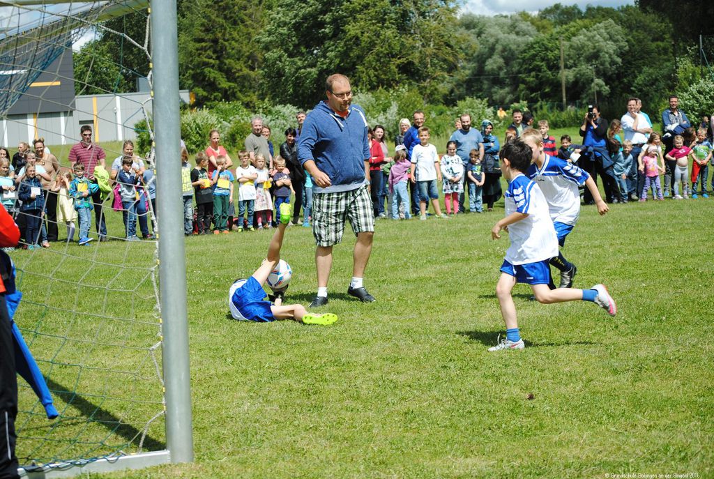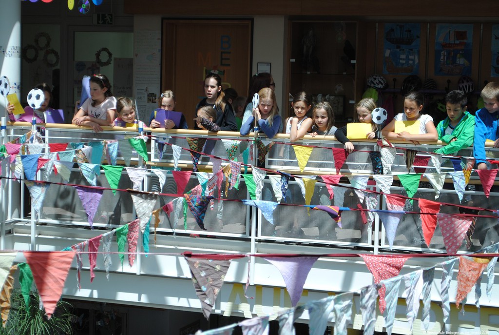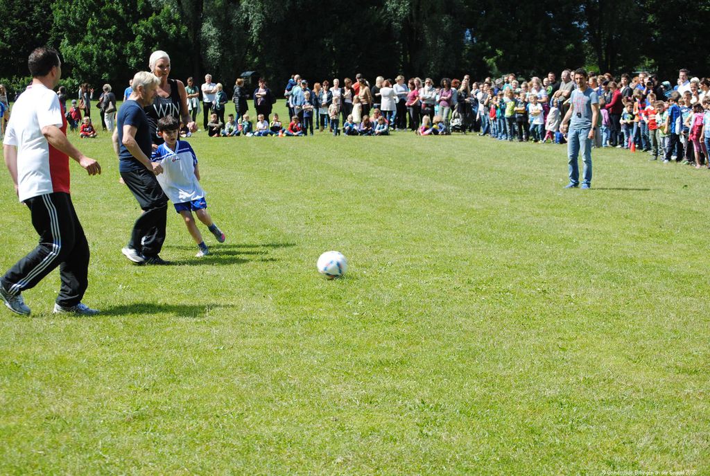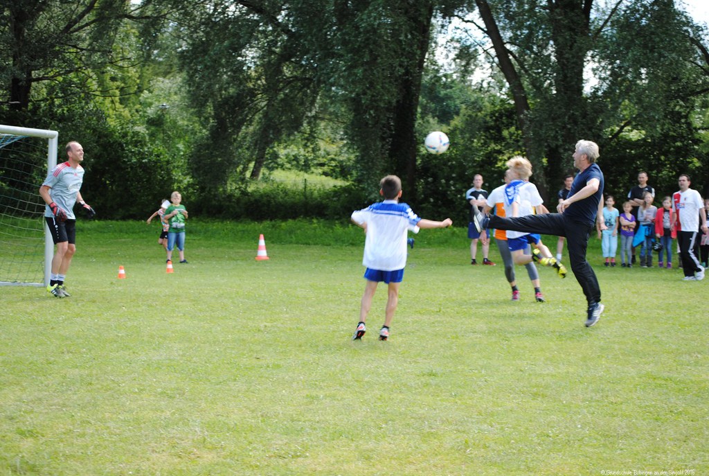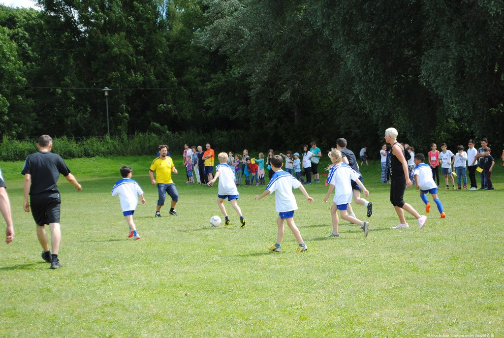 Nach einer kurzen Begrüßung und einem musikalischen "Ein Hoch auf uns" in der Aula spielte die Schulauswahl (Klasse 4a) gegen eine mutige Erwachsenen-Mann/Frauenschaft ein spannendes Fußballspiel. Ein kurzer aber heftiger Schauer beendete sowohl das Match beim Stand von beinahe 4:4 für die "Großen" als auch den regen Grill- und Café-Betrieb im Pausenhof.