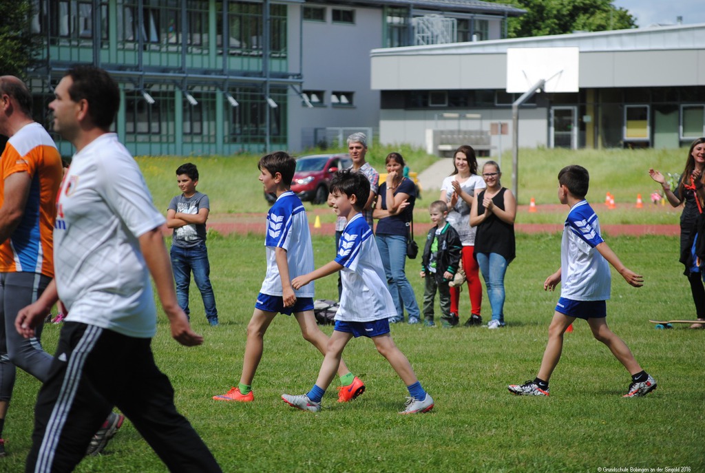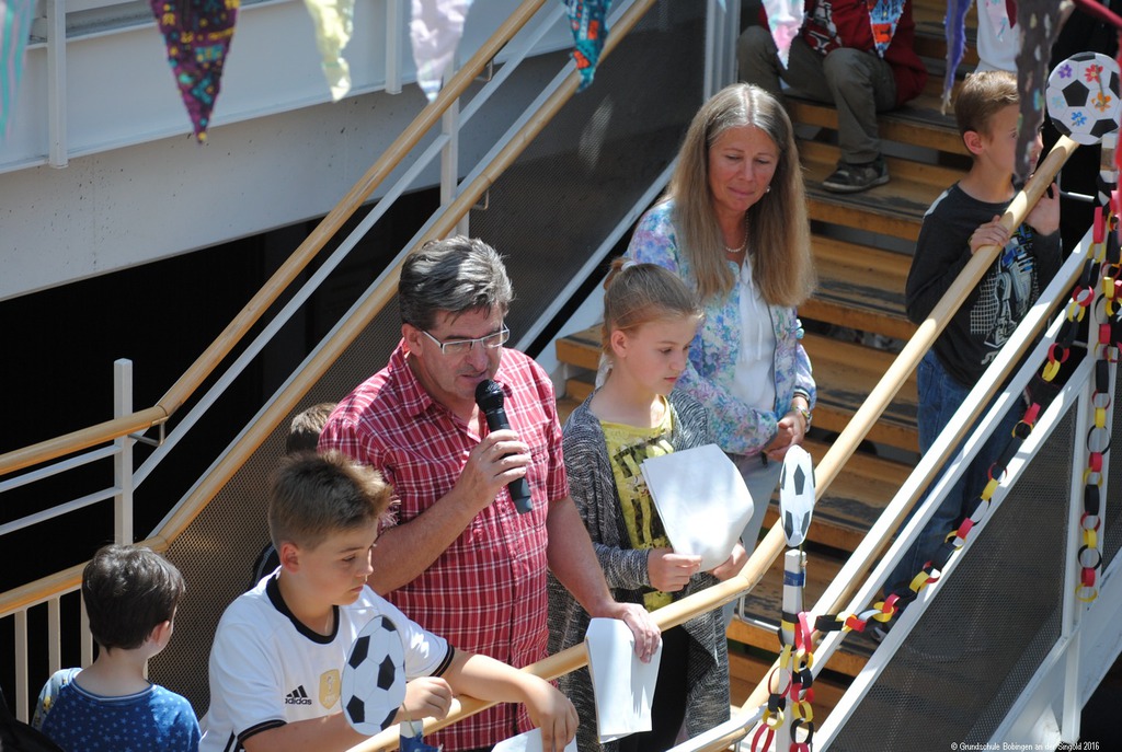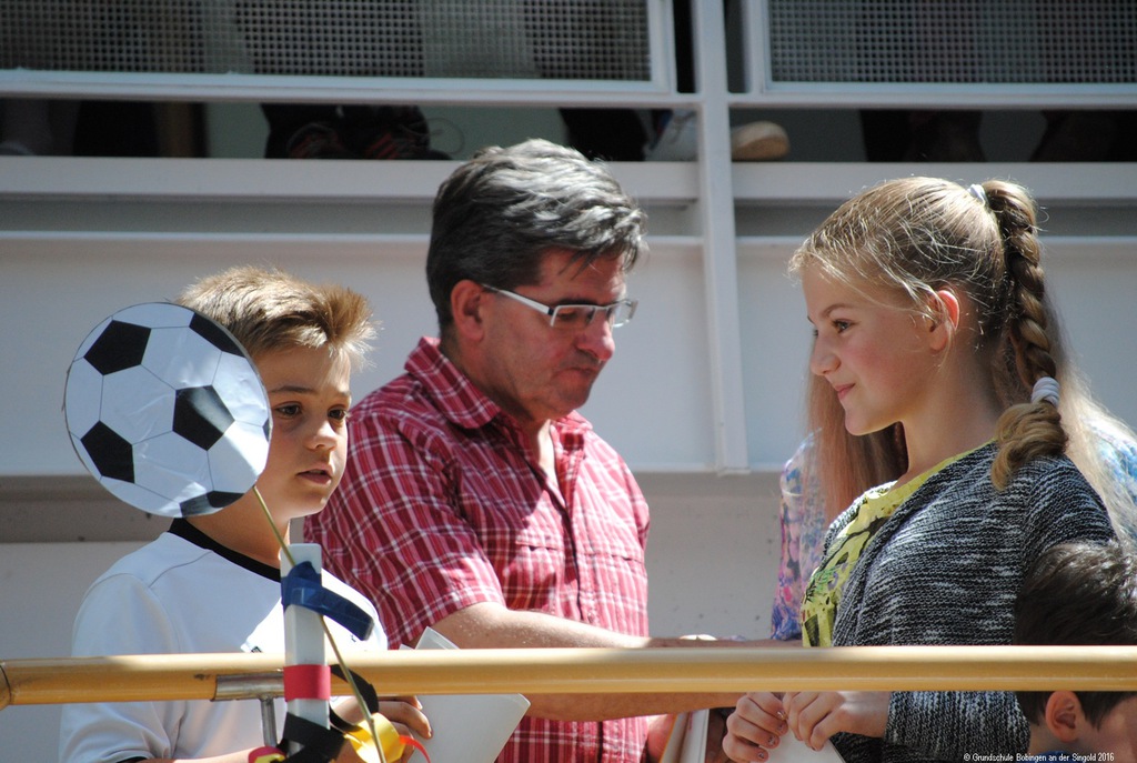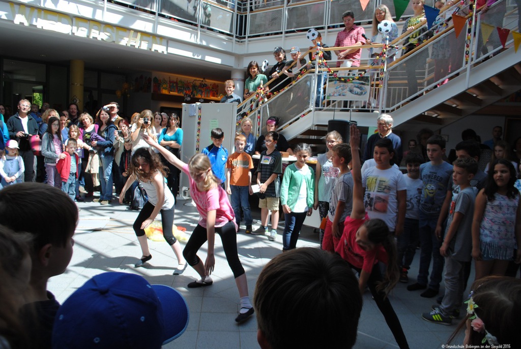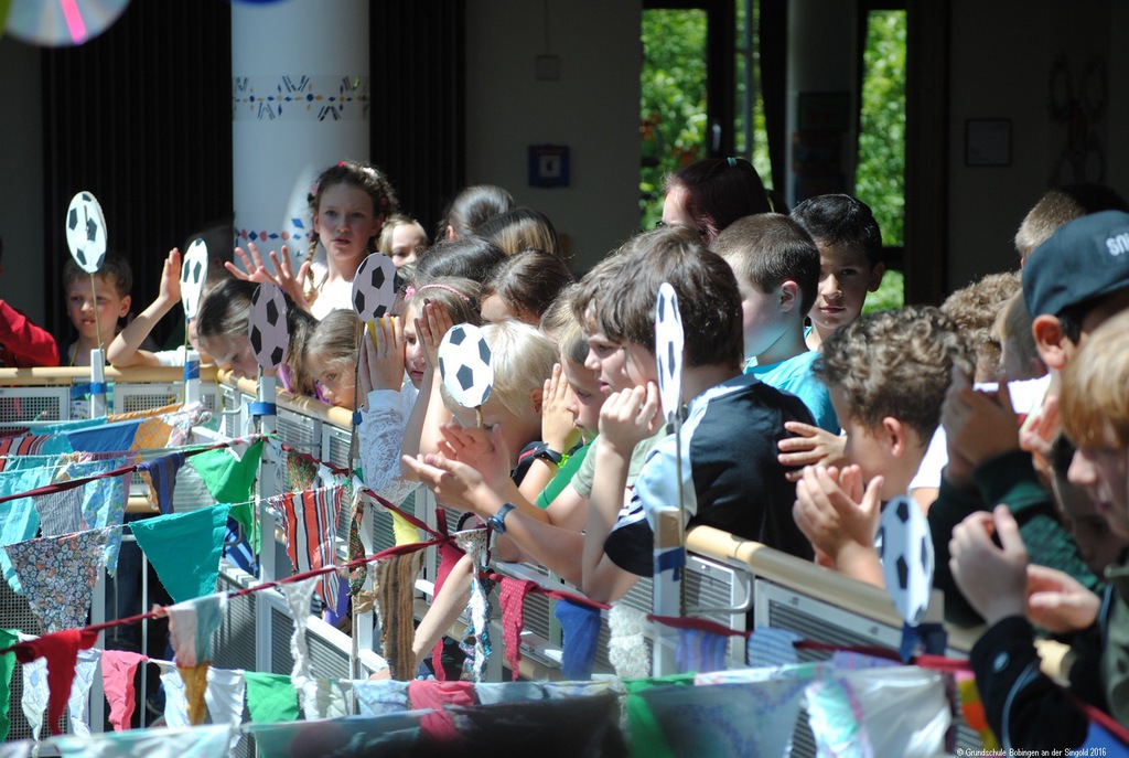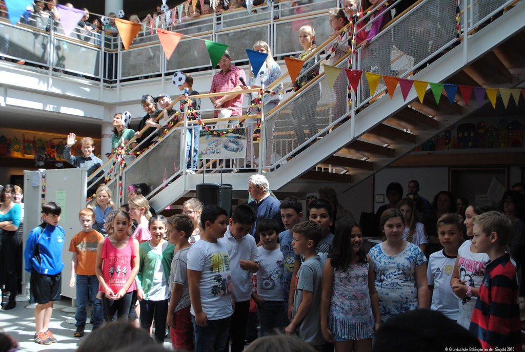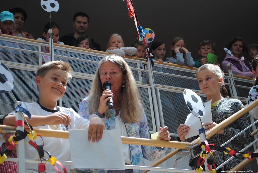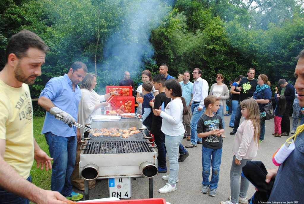 Nach einer kurzen Begrüßung und einem musikalischen "Ein Hoch auf uns" in der Aula spielte die Schulauswahl (Klasse 4a) gegen eine mutige Erwachsenen-Mann/Frauenschaft ein spannendes Fußballspiel. Ein kurzer aber heftiger Schauer beendete sowohl das Match beim Stand von beinahe 4:4 für die "Großen" als auch den regen Grill- und Café-Betrieb im Pausenhof.