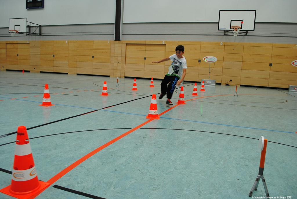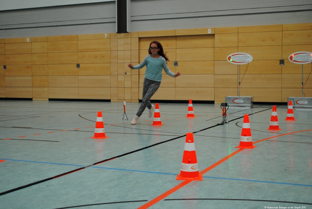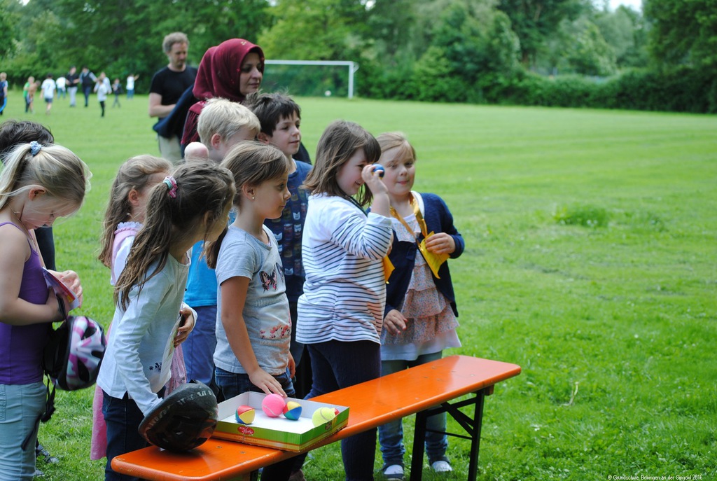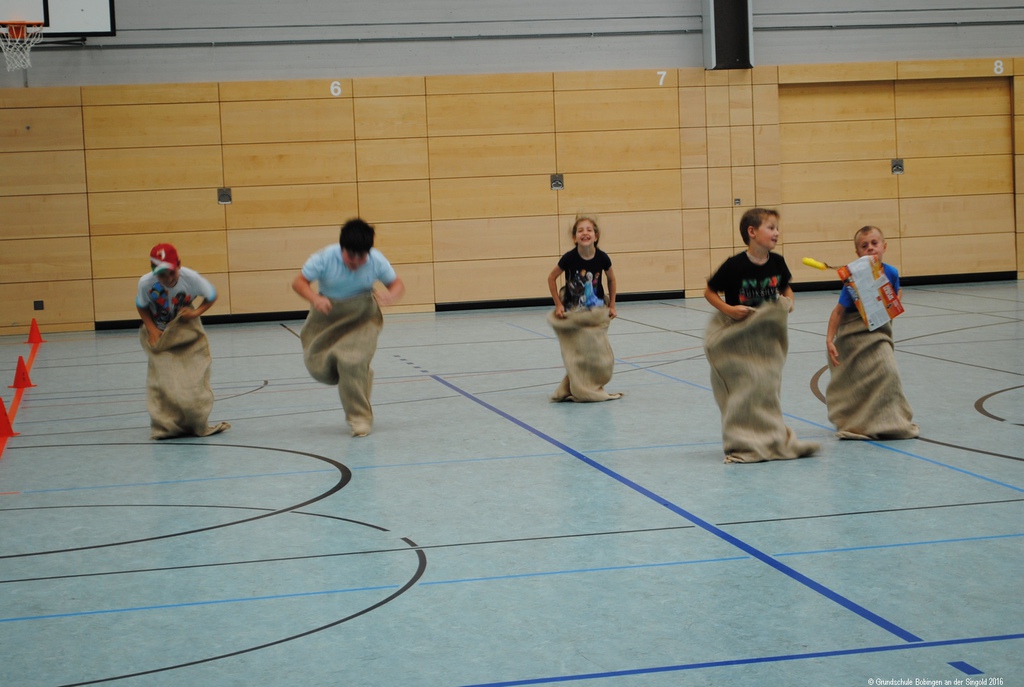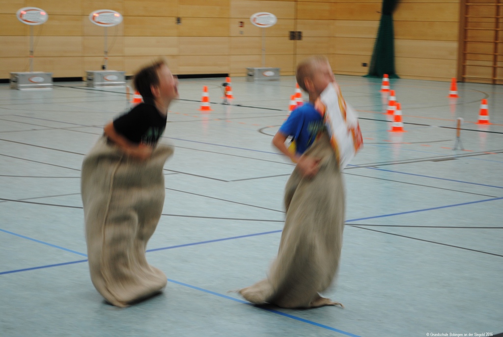 Mit Sackhüpfen, Dosenwerfen ("Ihr wartet bitte, bis ich hinter den Dosen weg bin"), Völkerball-Spiel und einem elektronisch gemessenen Lauf-Parcours ging es weiter bis zum frühen Abend.