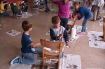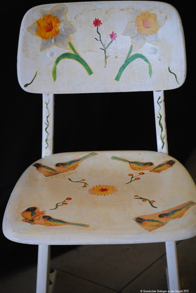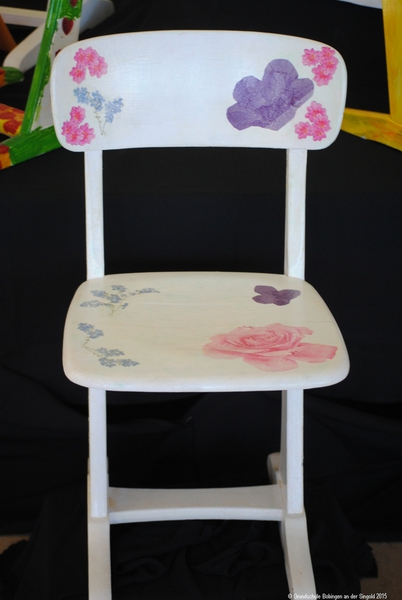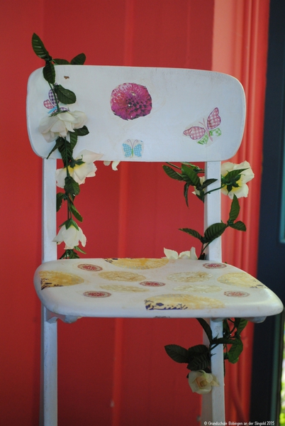Man greift zu Block, Bleistift, Schleifpapier, Farbe und Lack, macht Entwürfe, entfernt jahrelange Gebrauchsspuren, beschäftigt sich mit Material- und Farbenkunde, pinselt, lackiert und dekoriert, bis zum Schluss farbenfrohe, höchst kreative Stuhl-Unikate entstanden sind.