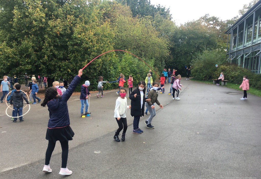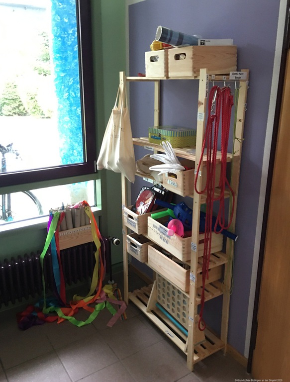 Daraus wuchs die Idee, den ehemaligen Pausenverkauf in einen Pausenverleih zu verwandeln und ihn als Spieleparadies auszustatten. Während des Lockdowns bestellten wir Spielsachen unterschiedlichster Art, von Turnbändern, über Kochgeschirr, Seilen, Frisbees bis zu einer richtigen Matschküche.