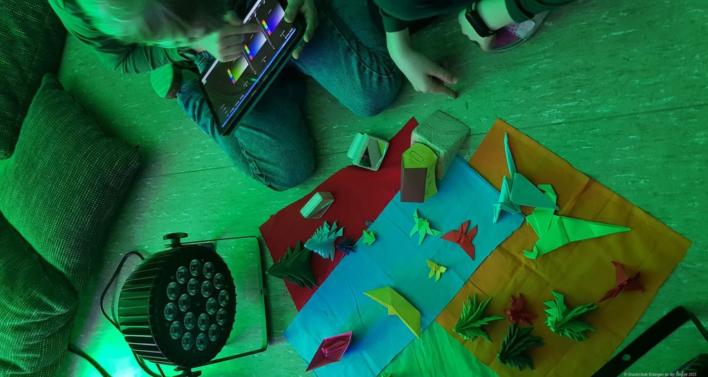 Am 21.3.2023 fand in der Klasse 3c über vier Unterrichtsstunden ein Projekt zum Thema „Licht“ statt. In zwei Gruppen näherten sich die Kinder spielerisch dem Thema, führten Experimente durch, um einen „Regenbogen“ mit einer Taschenlampe entstehen zu lassen, puzzelten Licht aus drei verschiedenfarbigen Scheinwerfern (blau, rot, grün) zusammen, untersuchten, wie sich farbige Bilder durch das Anstrahlen mit verschiedenfarbigen Scheinwerfern verändern, erfuhren die Zusammenhänge zwischen Licht und Energie und vieles mehr. Dank Daniel und Jonas aus der „variado Erlebniswerkstatt“ wurde es ein sehr kurzweiliger, interessanter und spannender Schulvormittag.